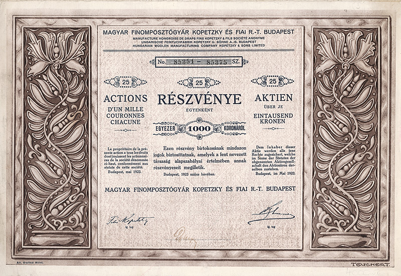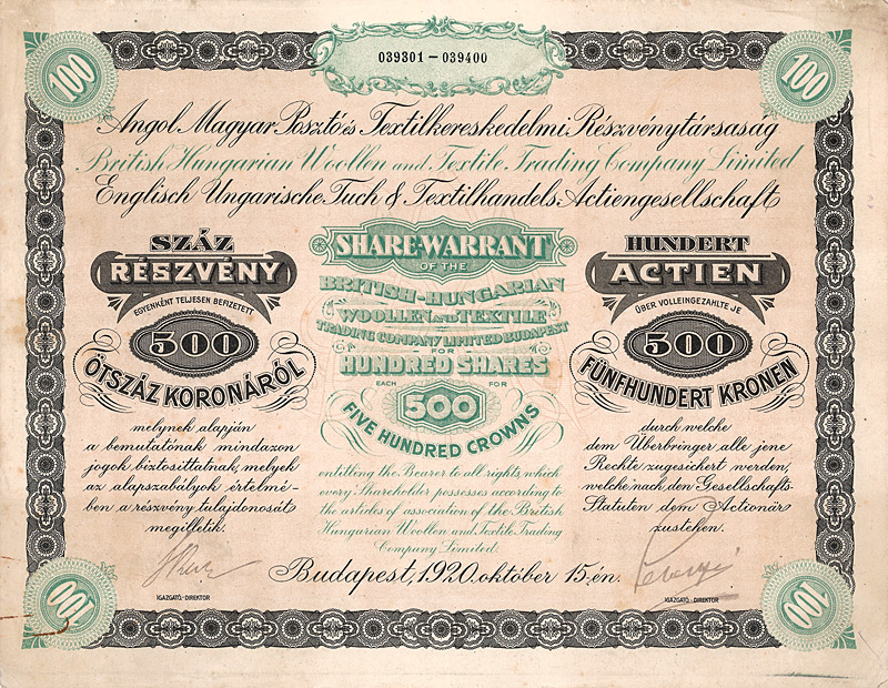 Gründung am 23.7.1920 unter Mitwirkung der Wiener Kommerzialbank. Ein Stück aus der 1. Kapitalerhöhung, beschlossen am 14.10.1920 zwecks Fusion mit der Firma Beckmann & Fischer, Tuchgroßhandlung. Aktientext dreisprachig ungarisch/englisch/deutsch, Originalsignaturen. Maße: 23,8 x 30,8 cm. Doppelblatt, mit kpl. Kuponbogen. Einzelstück aus der Auflösung einer uralten Sammlung, sehr günstig angeboten!