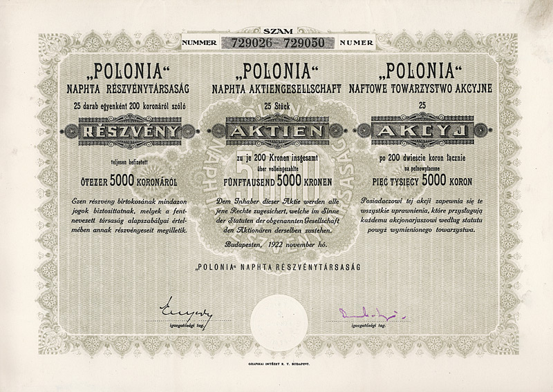 Die am 21.7.1921 gegründete Ges. gehörte dem Interessenkreis der Ungarisch-italienischen Bank an. Sie übernahm die Ölgruben Willy I., Willy II. und Tátra im Bezirk Drohobycz in Polen. 1924 erwarb sie weitere Schächte und eine Gasolin-Anlage. Dreisprachig ungarisch/deutsch/polnisch. Maße: 25 x 35 cm. Doppelblatt, mit restlichem Kuponbogen. Einzelstück aus der Auflösung einer uralten Sammlung, sehr günstig angeboten!