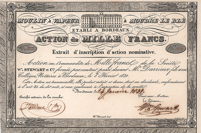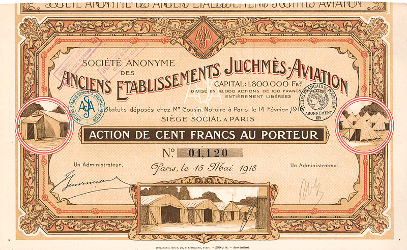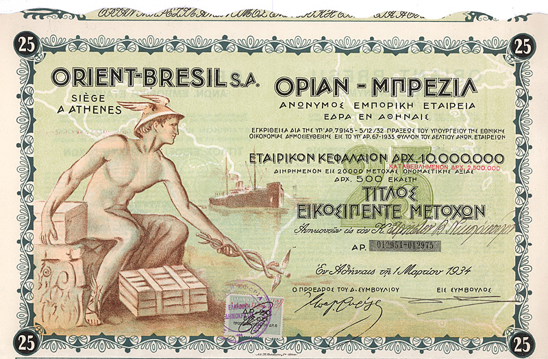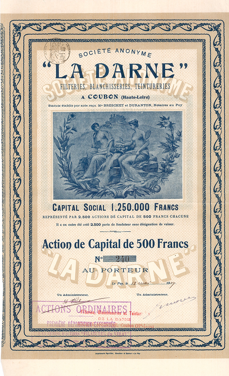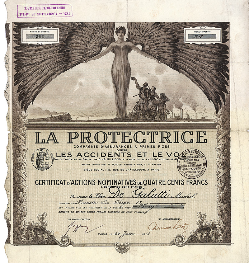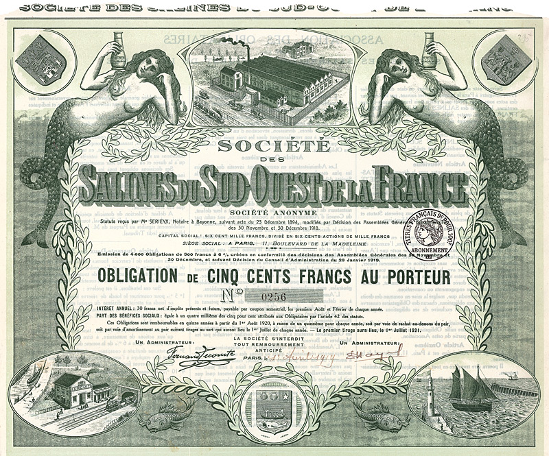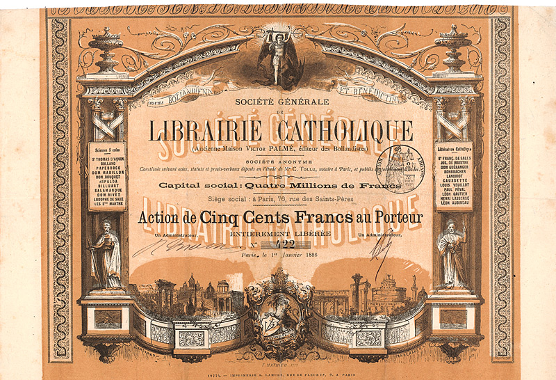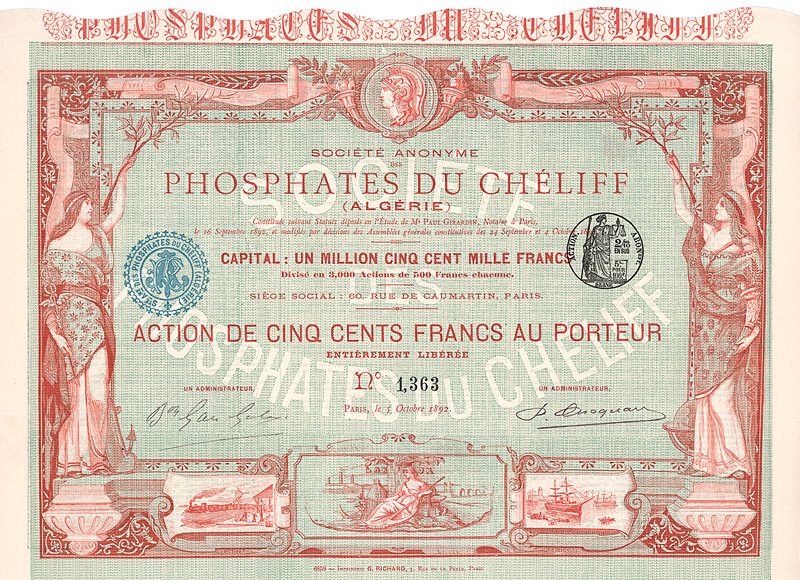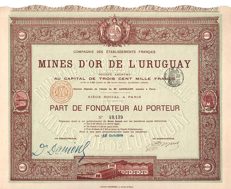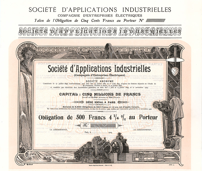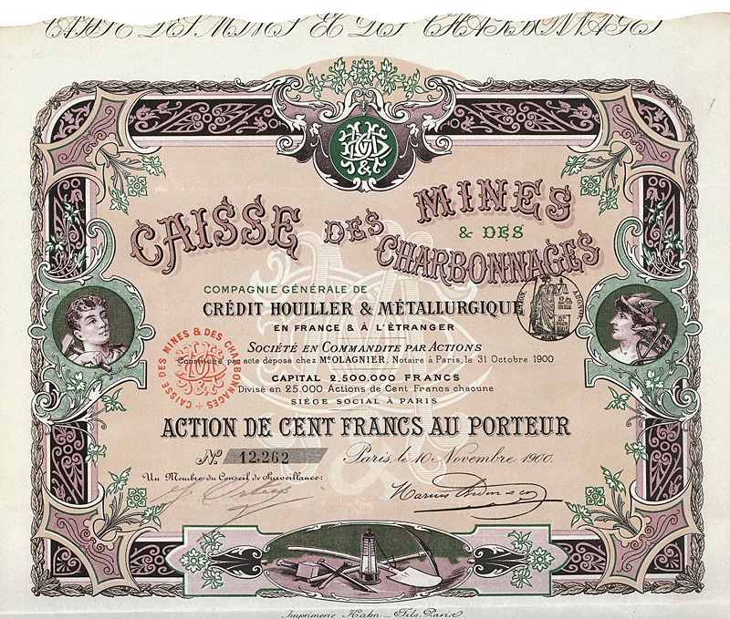 Gründeraktie. Französische Bank, deren Klientel aus dem Bergbau kam. Traumhafte Gestaltung mit Elementen des Jugendstils. Außerdem Abb. von zwei männl. Porträts, von denen eins Merkur darstellt sowie Abb. von Geräten aus dem Bergbau. Maße: 25,5 x 31,5 cm. Mit anhängenden Kupons.