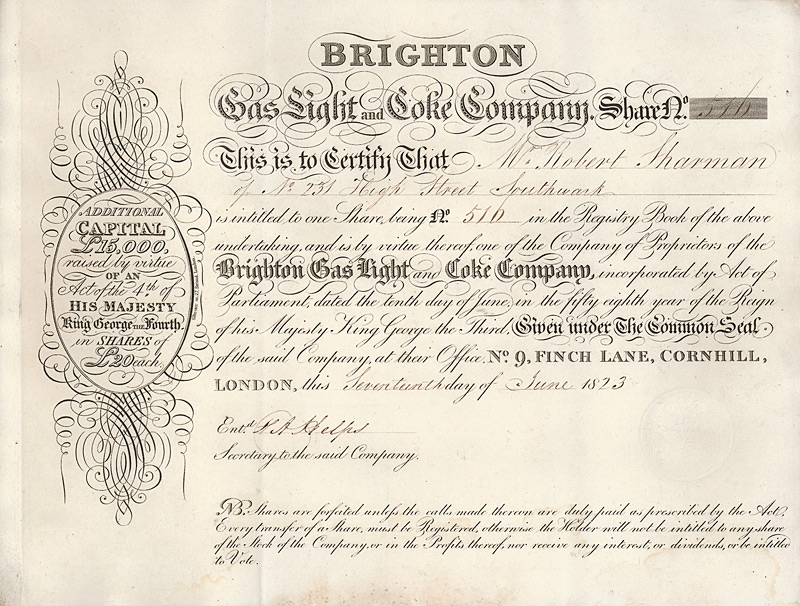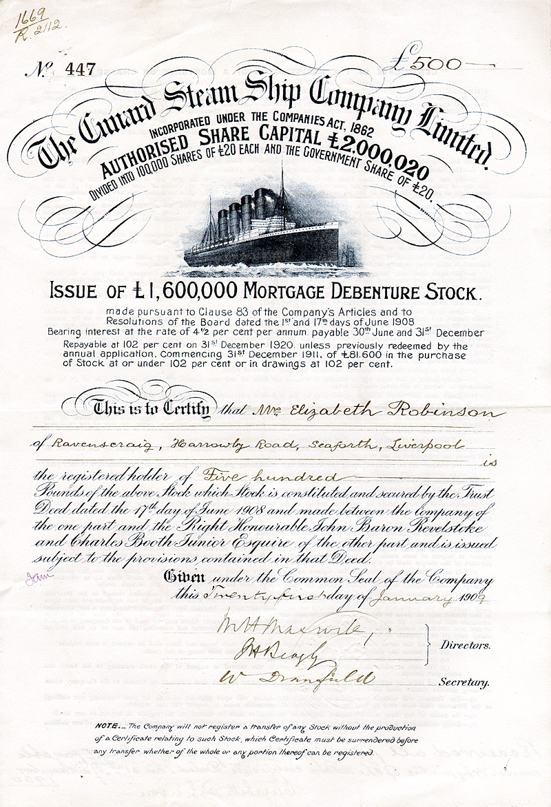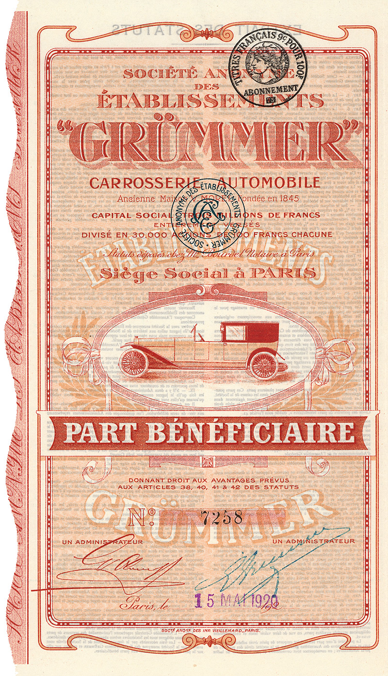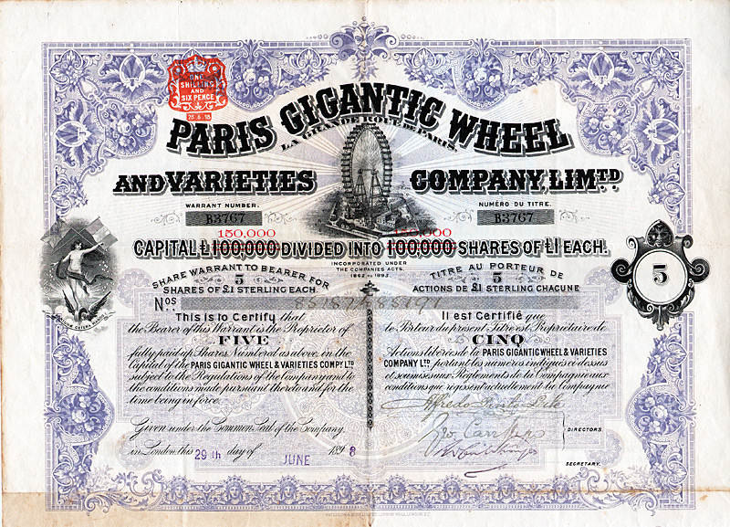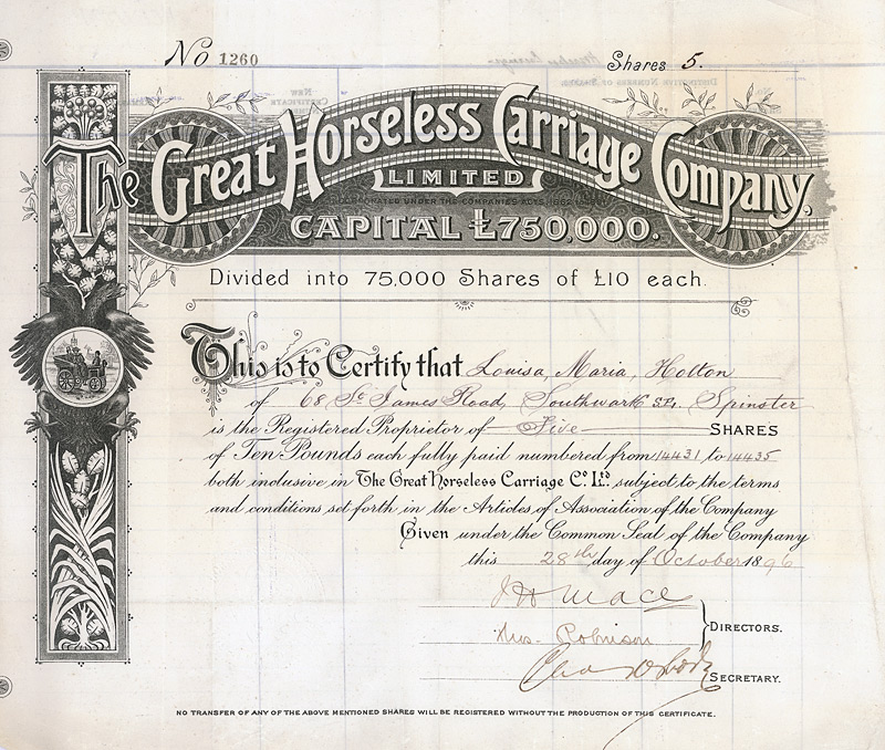 Gegründet am 14.5.1896 in Coventry von Harry Lawson. Henry John Lawson (1852-1925), auch als Harry Lawson bekannt, war Großbritanniens Automobilkaufmann Nummer Eins. Dem Vorstand der Gesellschaft gehörten außer Harry Lawson auch einige bekannte Persönlichkeiten an: Earl of Winchilsea and Nothingham, Gottlieb Daimler und Comte de Dion. Als leitender Direktor unterschrieb die Aktie eigenhändig J.H. Mace (leitender Direktor bei der Daimler Motor Co.) Maße: 27,2 x 32,2 cm. Knickfalten, sonst tadellose Erhaltung.