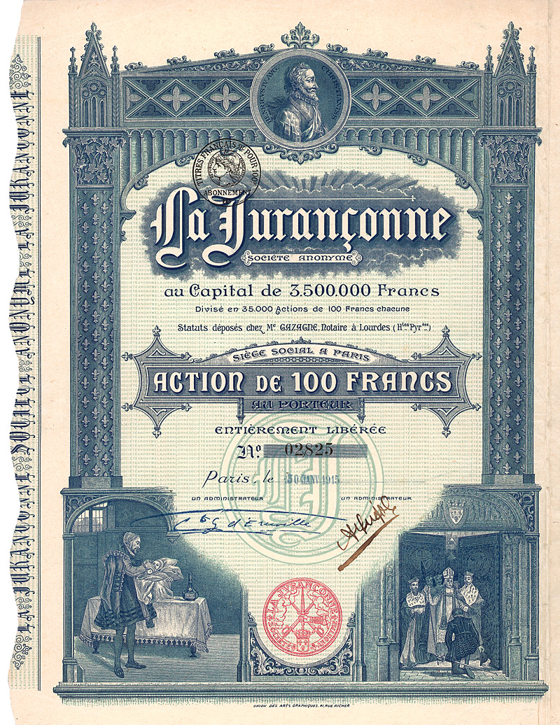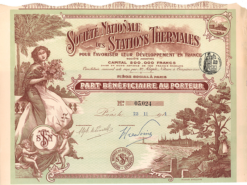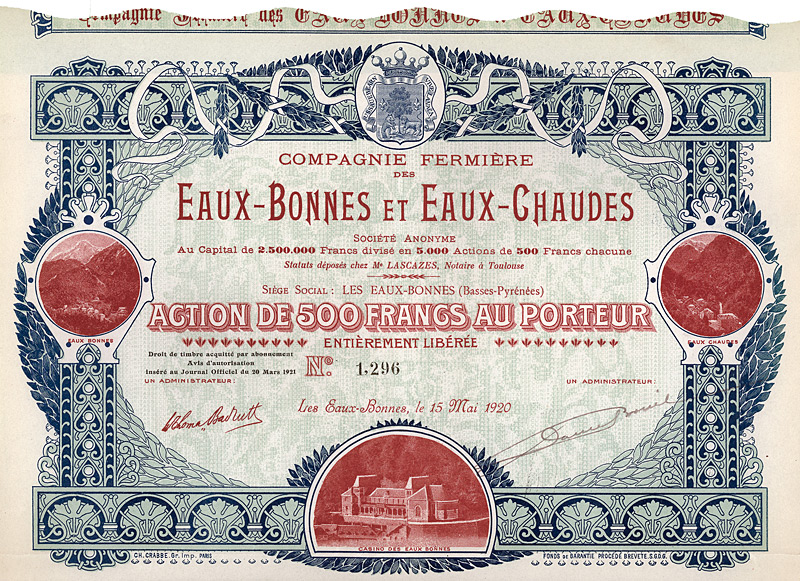 Gründeraktie, Auflage 5.000. Hochdekorative Jugendstil-Gestaltung mit Ansicht der beiden Heilbäder sowie des Casinos von Eaux Bonnes (in den Pyrenäen). Maße: 22,4 x 31,2 cm. Mit komplett anhängenden Kupons.