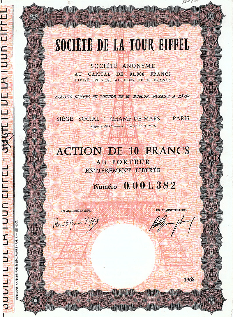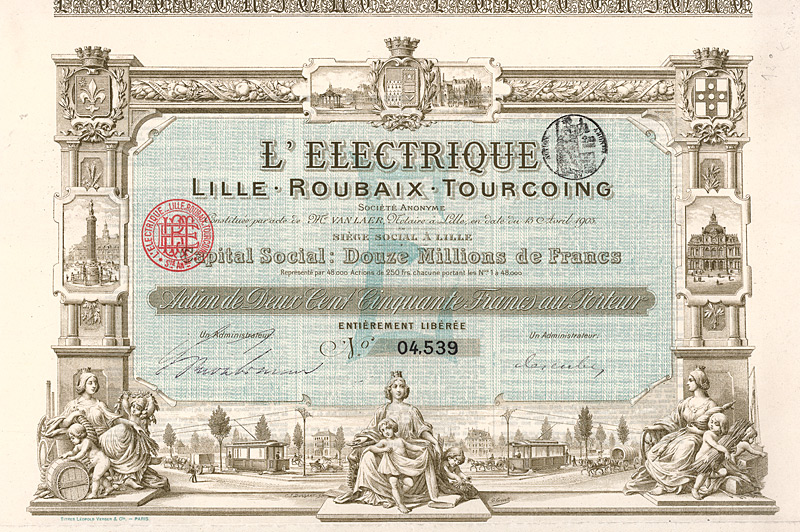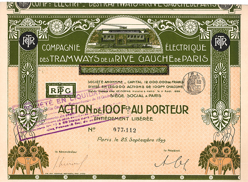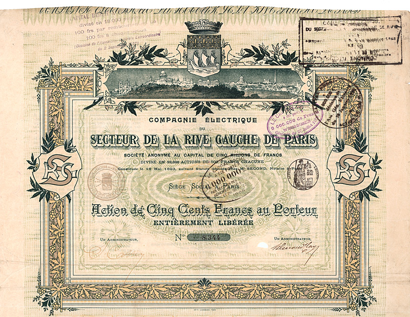Die 1893 gegründete Gesellschaft versorgte das Zentrum von Paris mit elektrischem Strom. Rive Gauche bedeutet linkes Ufer, im Bezug auf Paris bezeichnet es das südlich gelegene Stadtgebiet, u.a. das Quartier Latin, die Umgebung der Kirche St. Germain-des-Prés und das Montparnasse-Viertel. Großformatiges Papier mit sehr dekorativer Ansicht von Paris bei Nacht, hell erleuchtet; florale Verzierungen. Originalsignaturen. Rückseitig Statuten. Maße: 28,5 x 37,8 cm. Mit anhängenden restlichen Kupons. Lochentwertet.