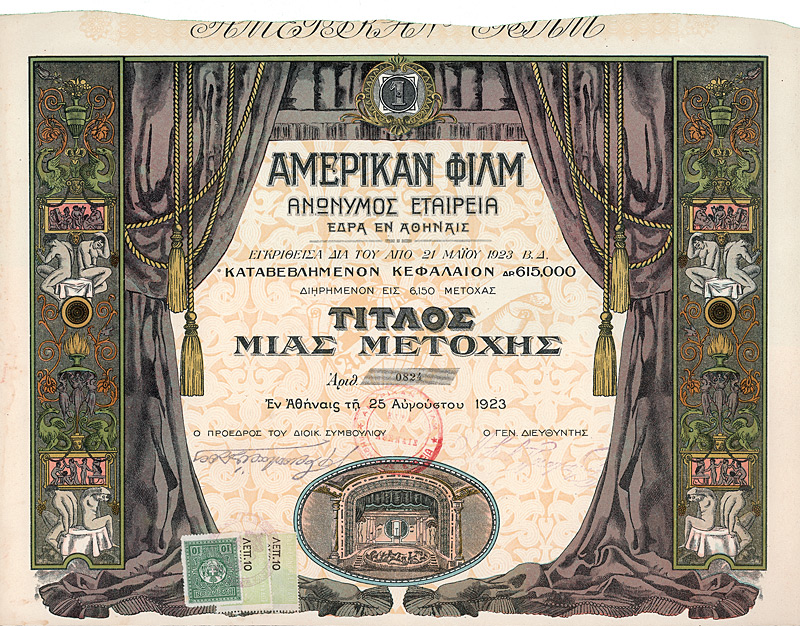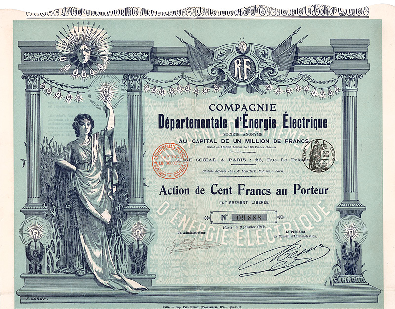 Auflage 10.000. Ausgesprochen dekoratives Stück mit Illustration über die ganze Aktienbreite: Säulenumrandung, weibliche Allegorie des Fortschritts mit Glühlampe, versch. Leuchten. In der Druckplatte vom Künstler signiert. Maße: 26,8 x 34,8 cm. Mit anhängenden restlichen Kupons.