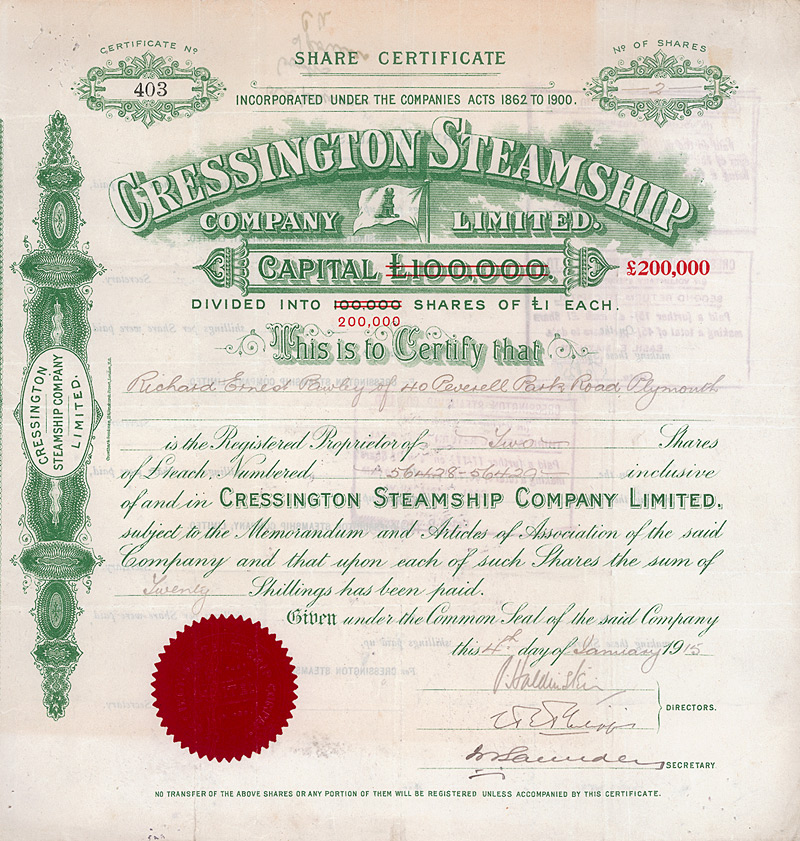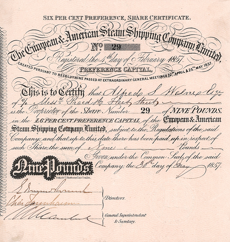 Als die European & American Steam Shipping 1857 gegründet wurde, kaufte sie quasi als “Erstausstattung” acht Stahlschiffe von der bereits 1848 von James Laming gegründeten General Screw Steam Shipping Company. Statt mit Geld wurde der Kaufpreis in Form von Aktien der neuen E&ASS Company bezahlt. Einer der Direktoren der Gesellschaft war T.R. Croskey, amerikanischer Konsul in Southampton. Vier der Schiffe (Golden Fleece, Hydaspes, Calcutta und Lady Jocelyn) wurden zum Liniendienst zwischen England bzw. Deutschland nach Südamerika eingesetzt, die anderen vier Schiffe (Queen of the South, Indiana, Argo und Jason) fuhren zweiwöchentlich zwischen Bremen, Southampton und New York. Auf der Südamerika-Tour teilte sich die Gesellschaft in Form eines Joint Ventures den Liniendienst mit der Hamburg Brasilianischen Packetschiffahrt Gesellschaft. Abfahrt- bzw. Anlaufhäfen in Europa waren Hamburg, Southampton und Antwerpen, Ziele in Brasilien waren die Städte Rio de Janeiro, Bahia und Pernambuco. Das Geschäft mit Südamerika florierte jedoch nicht und fuhr einige Verluste ein, etwas weniger dramatisch stellte sich der finanzielle Verlust beim Amerika-Geschäft dar. Man behalf sich, indem dann sieben Schiffe zunächst an die East India Company verchartert wurden. Kurze Zeit später wurde die Gesellschaft selbst für 250.000 Pfund an J.O. Lever verkauft, der große Anteile an der Galway Linie besaß. Lever vercharterte nun drei Schiffe an die Real Companhia de Navegacao a Vapor Anglo-Luso-Brasileira (1859), wo sie unter portugiesischer Flagge fuhren, und vier Schiffe an die Galway Linie (1859 und 1860). 1861 wurden sechs dieser Schiffe gänzlich verkauft an die East India & London Shipping Company. Das verbleibende achte Schiff, die Argo, war bereits 1859 abgewrackt worden. So war der European & American Steam Shipping Company insgesamt nur ein recht kurzes aber ereignisreiches Leben beschert. Ein interessantes Dokument europäischer Schiffahrtsgeschichte. Prägesiegel mit Abbildung der Reedereiflagge. Originalsignaturen. Maße: 20,7 x 19,7 cm.