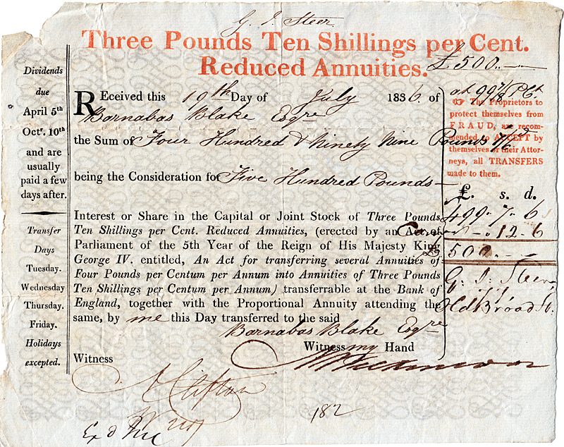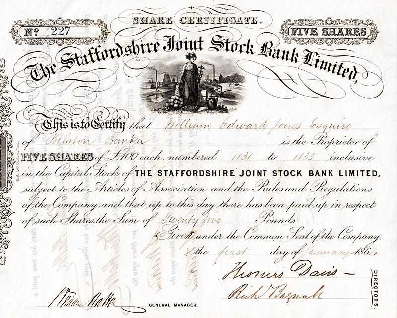 Die 1864 gegründete Bank hatte ihren Hauptsitz in der Temple Row in Birmingham sowie etliche Filialen in der damals ganz von der Montanindustrie geprägten Grafschaft Staffordshire in Mittelengland. Durch Übernahmen ab 1891 letztlich in der Hongkong & Shanghai Banking Corp. aufgegangen. Wunderschöne Vignette: im Vordergrund Fortuna mit Füllhorn und Merkur-Insignien, dahinter eine blühende Landschaft mit Hochöfen, rauchenden Schloten und Eisenbahn. Originalsignaturen. Maße: 20,2 x 24,9 cm.