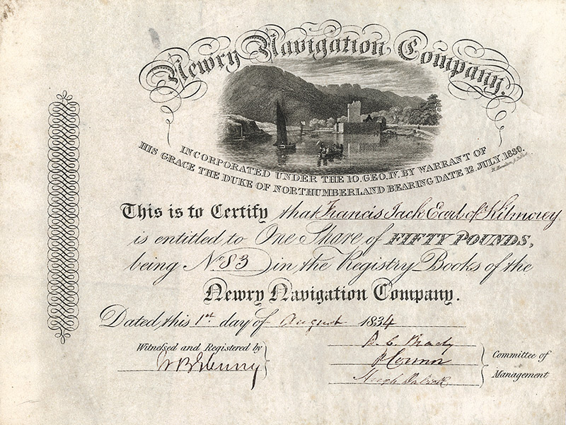 Die “Newry Navigation” im heutigen Nordirland besteht aus zwei Sektionen: Der bereits ab 1703 (nach der Entdeckung von Kohlevorkommen am Westufer des Lough Neagh in East Tyrone) projektierten “inland section” und dem ab 1760 gebauten Schifffahrtskanal zwischen Newry und der Irischen See. Die 18 Meilen lange “inland section”, erbaut zwischen 1731 und 1742, ist der überhaupt erste von Menschenhand geschaffene Kanal auf den Britischen Inseln und mit seinen 14 Schleusen ein Meilenstein des Kanalbaus überhaupt. Die Technik brachte der aus Deutschland stammende Architekt Richard Cassels mit, der den Kanalbau im Auftrag der “Commission of Ireland Navigation” bis 1733 leitete. Die Jungfernfahrt nach Fertigstellung der “inland section” absolvierte 1742 die “Cope of Lough Neagh” mit einer für Dublin bestimmten Ladung Kohle aus East Tyrone. Der 1769 fertiggestellte Schiffskanal zwischen Newry und dem offenen Meer ermöglichte der Stadt Newry dann, sich in der zweiten Hälfte des 18. Jh. zum grössten irischen Seehafen zu entwickeln. 1787 verlor die “Commission of Ireland Navigation” dann die Aufsicht über die Newry Navigation, welcher fortan unter der Kontrolle lokaler Behörden stand. Der Kanal war inzwischen in einem beklagenswerten Zustand, erst die 1800 vollzogene Abgabe der Verantwortung an den “Directors-General Inland Navigation” ermöglichte 1801-11 eine umfassende Instandsetzung und Vergrößerung vor allem der Schleusen. 1829 schließlich ging das Unternehmen an die neu gegründete private “Newry Navigation Company”. In der zweiten Hälfte des 19. Jh. geriet das Unternehmen wieder in große Schwierigkeiten, nicht nur wegen der aufkommenden Konkurrenz der Eisenbahnen, sondern auch, weil Newry als größter irischer Seehafen inzwischen von Belfast verdrängt worden war. Dem begegnete Newry mit der Vergrößerung des Schiffskanals nun für Schiffe bis 5.000 Tonnen. 1901 übernahm der “Newry Port and Harbour Trust” die Betriebsführung und mühte sich, den Kanal in Betrieb zu halten, doch letztlich ohne Erfolg: Nachdem schon 1939 das letzte Schiff die “inland section” befahren hatte, wurde sie 1949 stillgelegt, 1956 folgte auch das verbliebene kleine Reststück innerhalb der Stadt Newry. Der Schiffskanal zum offenen Meer wurde 1974 stillgelegt, er ist heute ein Paradies für Angler. Nachdem das Interesse an Bau- und Industriegeschichte erwachte, werden ausgewählte Teile des einstmals ersten Kanals der Britischen Inseln seit 1989 restauriert und für die Nachwelt erhalten. Herrlicher Kupferstich auf Kalbspergament. Die große Vignette zeigt ein Ruderboot und einen Segelkahn auf dem Wasser, am Ufer eine Burgruine und im Hintergrund einen Gebirgszug. Maße: 18,6 x 24,5 cm. Mehrere Originalsignaturen, keine Entwertung.