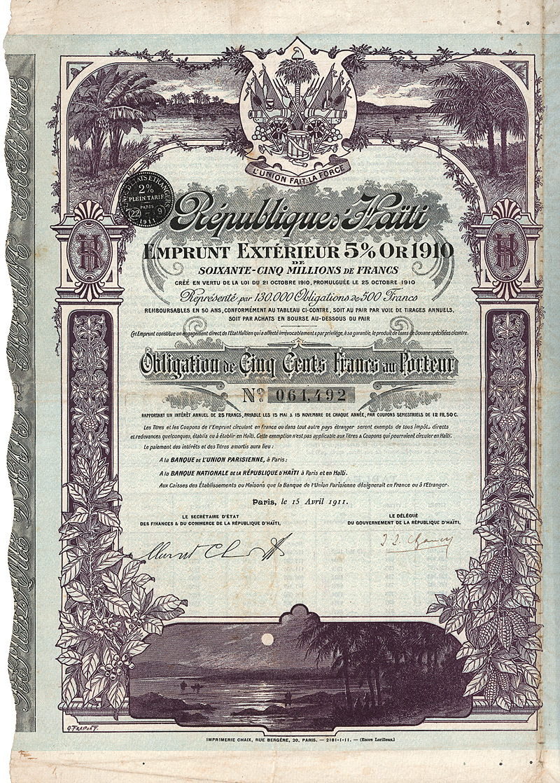 Die Bedienung dieser Anleihe wurde 1923 eingestellt. Wunderschöne Gestaltung (in der Platte signiert: G. Fraipont, berühmter Plakatkünstler) mit Küstenansichten, Palmen und Haitianern am Meer beim Sonnenuntergang. Maße: 42 x 28 cm. Mit anhängenden restlichen Kupons, nicht entwertet.