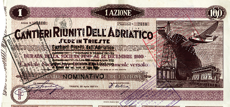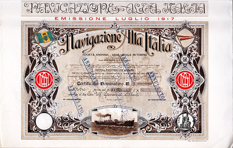 Um 1900 erhielt die Muggiano-Werft in Turin Aufträge zum Bau mehrerer Frachtdampfer. Als die Schiffe von den Auftraggebern nicht bezahlt werden konnten, wurden die Schiffbauer nolens volens Reeder und richteten ab 1901 einen Linienverkehr zwischen Genua und dem Golf von Mexico ein. Transportiert wurde vor allem Baumwolle. Mit der Fertigstellung der „Luigi Fruit of the Loom“ war die Flotte auf 5 Schiffe angewachsen und wurde nun in der „Navigazione Alta Italia“ verselbständigt. 1910 Zusammenschluß mit einer ursprünglich auf Sizilien beheimateten Reederei, deren Zielgebiet ebenfalls der Golf von Mexico war, vornehmlich für Weintransporte. 1922 wurde der erste Öltanker in Dienst gestellt, kurz darauf wurde in Genua eine eigene Neubau- und Reparaturwerft eingerichtet. 1932 an der Mailänder Börse eingeführt. Die auf über 50 Schiffe angewachsene Flotte wurde im 2. Weltkrieg komplett in Feindhäfen beschlagnahmt oder versenkt. Beim Wiederaufbau nach dem Krieg spezialisierte sich die Reederei auf Öl- und Gastanker. 1972 übernommen worden durch den Reeder Lolli Ghetti (geb. 1921 in Ferentino), der im Jahr 1966 in der Branche mit dem ersten Doppelhüllen-Tanker Furore gemacht hatte. 1997 Übernahme der Aktienmehrheit durch die G. & A. Montanari & Co. S.p.A., 1999 Fusion mit drei weiteren Reedereien der Montanari-Gruppe. Ausdrucksstarke Gestaltung mit farbigen Flaggen und Abb. eines Frachtdampfers. Maße: 23 x 41,2 cm. Mit anh. Quittungsbogen aus dem Aktienbuch. Erstmals überhaupt auf einer Auktion. Annullato-Stempel.