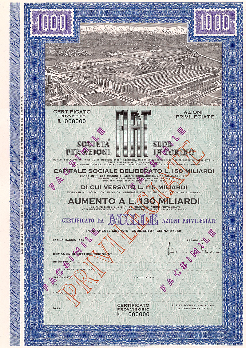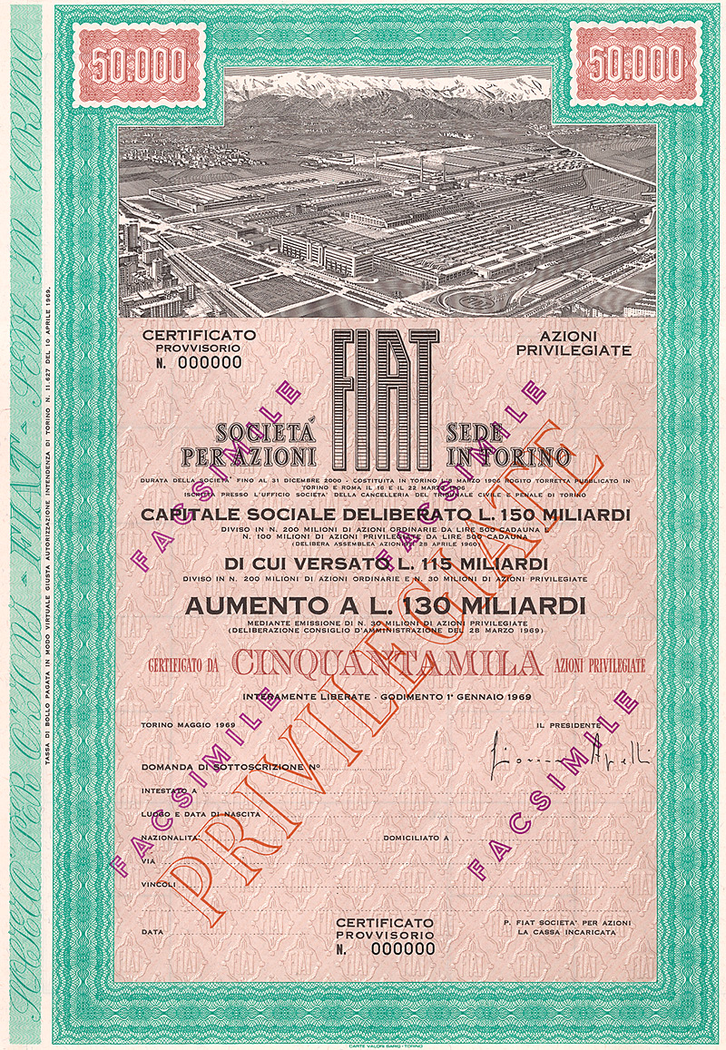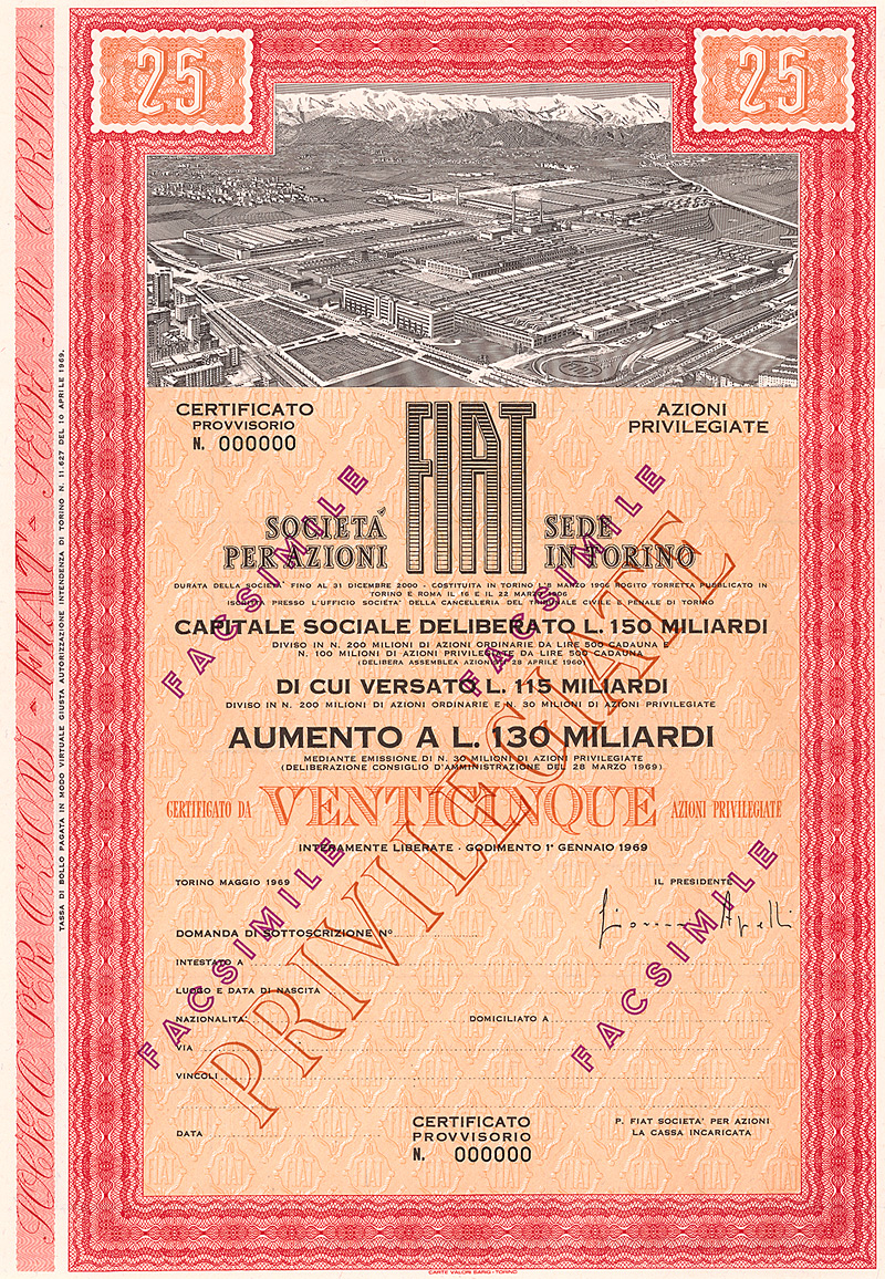 Nullgeziffertes Specimen. Giovanni Agnelli, der Graf von Ruffia und der Graf von Bricherasio gründeten 1899 die FIAT-Werke (Fabbrica Italiana Automobili Torino). 1906 wurde das Unternehmen eine AG. Anfang der 20er Jahre eröffnete eine bedeutende Erweiterung der Produktion den Weg zum Massen-Hersteller. In den letzten Jahren lieferte sich FIAT mit VW einen ständigen Kampf um die Spitzenposition auf dem europäischen Markt. Meist gewinnt VW, doch FIAT kann sich rühmen, mit über 100 Jahren die wesentlich längere Automobil-Tradition zu besitzen. Zum FIAT-Konzern gehörte u.a. auch die Edelmarke Lamburgini sowie Alfa Romeo. Ende der 1990er Jahre beteiligte sich General Motors an der FIAT-Autosparte. Erst war eine langfristige Komplettübernahme geplant, doch 2004 war die finanziell kurzatmige GM froh, sich aus dem Engagement wieder herauskaufen zu können. Um den Einfluß der Agnelli-Familie zu erhalten, begab FIAT erstmals 1960 neben den Stammaktien auch Vorzugsaktien. Bei der Kapitalerhöhung 1969 wurden zusätzlich zu den schon vorhandenen 30 Mio. Stück weitere 30 Mio. neue Vorugs-Aktien ausgegeben. Großes Hochformat, riesige Ansicht des gigantischen FIAT-Werkes bei Turin aus der Vogelperspektive. Faksimile-Unterschrift Giovanni Agnelli. Maße: 34,1 x 22,5 cm. Mit anhängenden Kupons. Sämtliche FIAT-Aktien wurden inzwischen eingezogen und praktisch alle vernichtet. Deshalb unter den Automobilwerten nicht nur eines der bedeutendsten Stücke, sondern auch eine Riesen-Rarität. Unikat aus dem Uralt-Besitz des für den FIAT-Aktienhandel damals zuständigen amtlichen Kursmaklers.