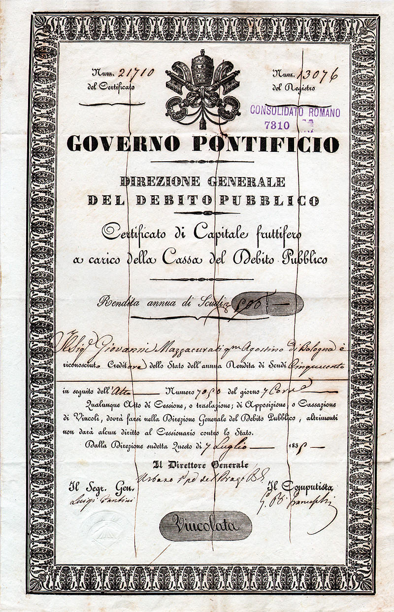 Certificato di Capitale fruttifero Rendita annua di Scudi 900, Nr. 21710