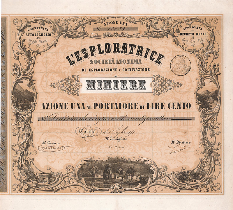 Italienische Bergbau-Gesellschaft, 1853 gegründet. Äußerst dekoratives, großformatiges Stück, drei Berglandschafts-Vignetten., Lithographie. Originalsignaturen. Maße: 30 x 33. Äußerst seltenes Stück, seit über 10 Jahren nicht mehr angeboten.