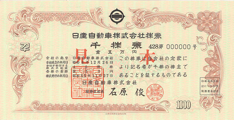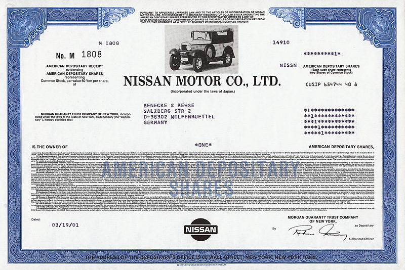 Nullgeziffertes Specimen. 1914 wird das erste Datsun-Automobil gebaut. 1933 wird Nissan gegründet, zunächst als Motorenbauer und Nutzfahrzeugproduzent, während des 2. Weltkrieges werden auch Flugmotoren gebaut. 1937 ist der Datsun Typ 15 das erste in Japan fließbandmäßig hergestellte Auto. 1958 startet der Datsun-Export in die USA. 1960 gründet Nissan eine Tochter in Gardena/California, im gleichen Jahr erscheint mit dem SPL 210 der erste Datsun-Sportwagen. 1966 entsteht bei der Nissan Mexicana das erste Werk eines japanischen Herstellers auf dem amerikanischen Kontinent. 1969 ist der Datsun 240Z der meistverkaufte Sportwagen der Welt: Für eine Produktion von 1/2 Mio. Stück brauchte die berühmte Corvette 25 Jahre, der Datsun schaffte es in 10 Jahren. 1980 wird die Nissan Motor Manufacturing Corp. in Smyrna/Tennessee gegründet. 1983 verschwindet der Markenname Datsun, fortan werden die Fahrzeuge weltweit als Nissan vermarktet. 1999 beginnt die Allianz zwischen Nissan und Renault. Maße: 10,8 x 21 cm. Einzelstück aus einer alten Automobil-Spezialsammlung.
