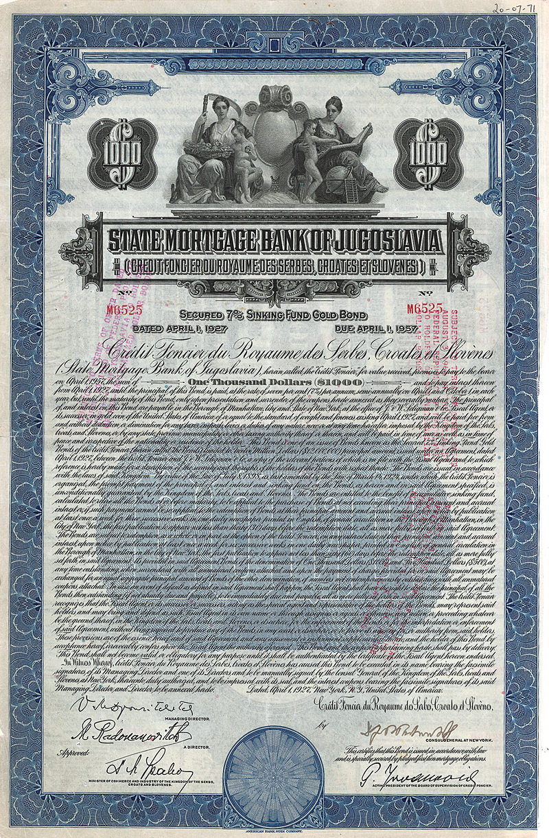 Die Wurzeln der Staatshypothekenbank des Königreichs der Serben, Kroaten und Slovenen reichen bis 1862 zurück. Reorganisiert 1898 und 1922, übernahm sie die Geschäfte der vorherigen Departement-Sparkasse. Für alle Verbindlichkeiten bürgte der Staat. Blau/schwarzer ABNC-Stahlstich, schöne Vignette: Mütter mit Kindern, Landwirtschaft und Bildung symbolisierend. Die Anleihe war bis 1957 fällig. 1967 unterbreitete die Sozialistische Bundesrepublik Jugoslawien den Anleihegläubigern eine Regulierung, wonach diese Anleihe zukünftig mit 3 resp. 3,5 % zu verzinsen war. Für die über weitere 50 Jahre laufende Rückzahlung wurde ein Tilgungsfonds eingerichtet. Maße: 38,4 x 25 cm. Rechter Rand knapp geschnitten. Das vorliegende Stück ist unentwertet, hat einen neuen Kuponbogen nach der Schuldenregulierung mit Kupons ab Nr. 33 (fällig ab 1984) und muss nach den Umschuldungsbedingungen bis heute bedient werden.