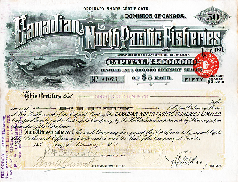 Die Gründung der Pacific Whaling Company (der späteren Canadian North Pacific Fisheries) im Jahr 1905 markiert den Beginn des kommerziellen Walfangs im Nordpazifik. Zuvor hatten die Initiatoren Captain Sprott Balcom und Captain William Grant mit ihren Schiffen Pelzrobben gejagt. Nachdem diese fast ausgerottet waren, wandte man sich dem Walfang zu. Auf Inselgruppen vor der Küste von British Columbia wurden fünf feste Walfangstationen errichtet. Ein drastischer Rückgang der Fänge im Jahr 1914 führte 1915 zum Konkurs dieser Gesellschaft. Die Fangstationen und Walfangschiffe kaufte der Amerikaner William P. Schupp, dem bereits zwei Walfangstationen vor der Küste von Alaska und eine im Staat Washington gehörten. Schupp formte daraus die “Consolidated Whaling Corporations Ltd.” Vor der Küste von British Columbia wurden bis zur Einstellung des Walfangs im Jahr 1967 insgesamt 24.427 Wale erlegt. Herrlicher Stahlstich von Waterlow & Sons mit großer Walfangszene. Maße: 21,2 x 28,4 cm.