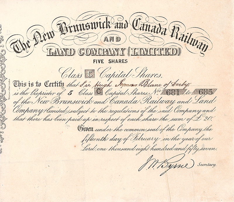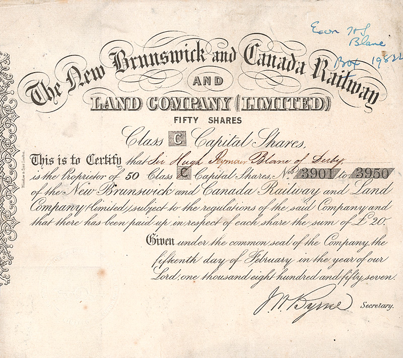 Gegründet 1835 als St. Andrews & Quebec Ry. zum Bau einer Bahn in britischer Kolonialspur (1676 mm, im Jahr 1877 auf Normalspur umgespurt) vom Hafen Saint Andrews nach Quebec. Erst 1851 begann der Bahnbau, machte nur langsame Fortschritte und erforderte schließlich 1856 die Reorganisierung als New Brunswick & Canada Ry. Zu dieser Zeit war erst ein 35 km langes Teilstück bis Dumbarton befahrbar. Mitte 1862 wurde Richmond an der Grenze zum US-Bundesstaat Maine erreicht. 1866 ging eine 31 km lange Zweigstrecke zur Hafenstadt Saint Stephen in Betrieb (Betriebsführung durch die NBCR, formell im Besitz der St. Stephen Branch Ry.), 1868 folgte eine 18 km lange Zweigstrecke nach Woodstock. Auf dem Territorium des US-Bundesstaats Maine wurde die Bahn 1870 durch die Houlton Branch RR (ab 1873 durch die NBCR gepachtet) bis Houlton verlängert. 1882 wurde die NBCR auf 999 Jahre an die im Norden anschließende New Brunswick Ry. verpachtet. Dieser Vertrag ging 1890 auf die Canadian Pacific Ry. über. Erst 1989 wurde ein Teil der Strecken stillgelegt, der Abschnitt von McAdam bis St. Stephen wird bis heute von der New Brunswick Southern Ry. befahren. Prägesiegel mit Abbildung einer Dampflokomotive. Maße: 20,5 x 23,5 cm.
