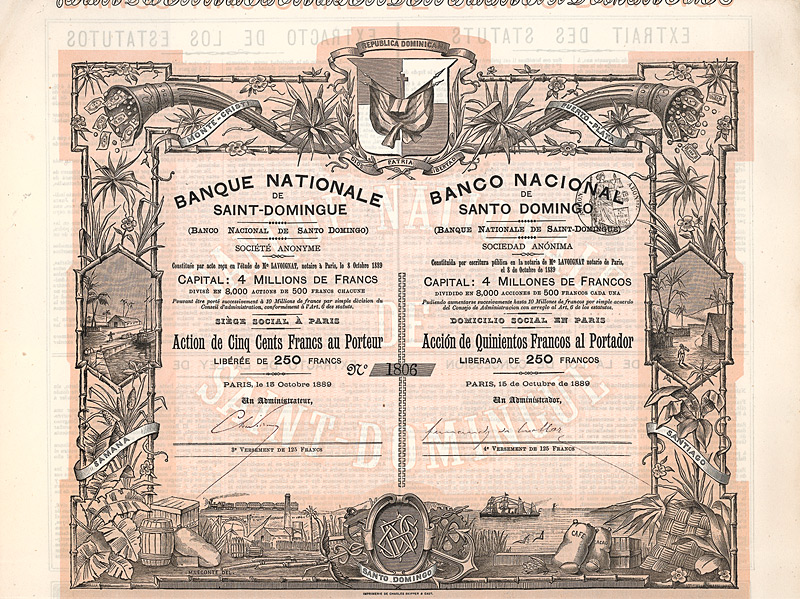 Gründeraktie, Auflage 8.000. Gründung am 8.10.1889 in Paris. Santo Domingo, Hauptstadt der seit 1844 bestehenden Dominikanischen Republik, ist mit seiner Gründung im Jahr 1496 durch Bartolomeo Columbus die älteste Europäer-Stadt der Neuen Welt. Die Insel Haiti, deren größeren östlichen Teil die Dominikanische Republik einnimmt, war damals eine der fruchtbarsten Gegenden der Erde. Der Eröffnung einer 155 km langen Eisenbahn im Jahr 1887 folgte ein wirtschaftlicher Aufschwung, der auch die Gründung der Nationalbank möglich machte. Ungewöhnlich dekorativ, mit geldspuckenden Füllhörnern, Hafen, Siedlung, exotischen Pflanzen, Eisenbahn, Frachtschiff sowie Fässern und Säcken mit Tabak, Kaffee und Kakao. Zweisprachig. Maße: 26,8 x 35,8 cm. Rückseitig Statuten, mit anhängenden restlichen Kupons.