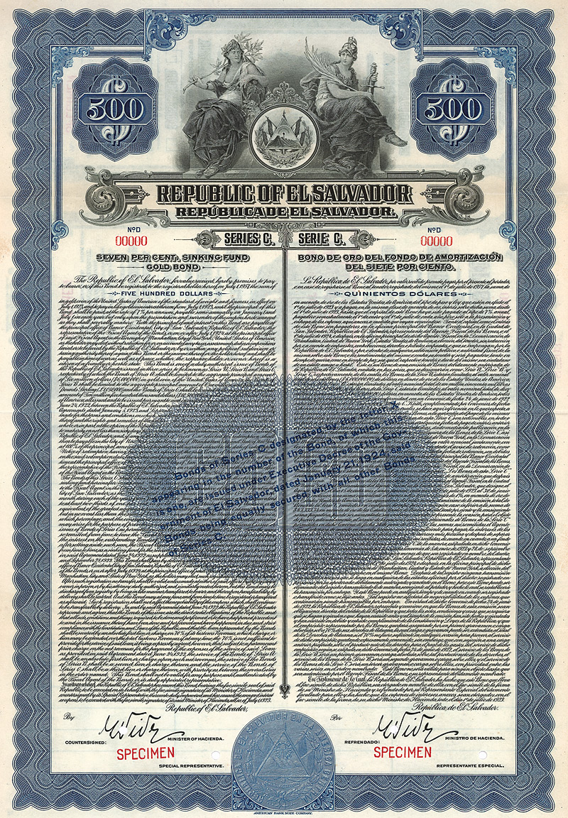 Die kleinste mittelamerikanische Republik. Teil einer Anleihe im Gesamtvolumen von 6 Mio. $. Große, hochdekorative ABNC-Stahlstichvignette mit zwei weiblichen Allegorien, dazwischen Wappenvignette. Zweisprachig englisch/spanisch. Maße: 37,2 x 25,9 cm. Mit anhängenden Kupons. Lochentwertet. Rarität aus dem aufgelösten ABNC-Archiv.