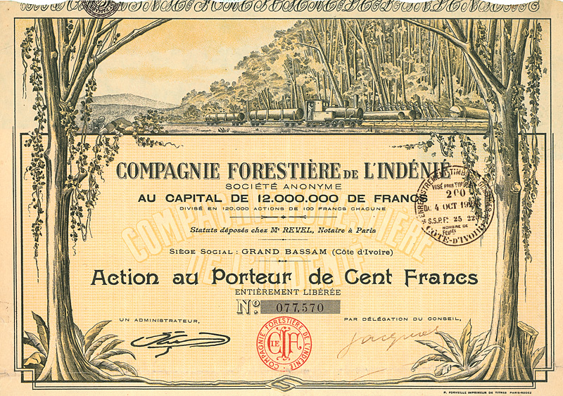 Grand Bassam in der Elfenbeinküste liegt direkt am Golf von Guinea, was die Verschiffung des hier geschlagenen Tropenholzes besonders einfach machte. Herrliche Gestaltung mit Urwald, Baumriesen und Waldarbeitern bei der Verladung von Holzstämmen auf eine Waldbahn. Maße: 22,4 x 31,4 cm. Mit anhängenden restlichen Kupons.
