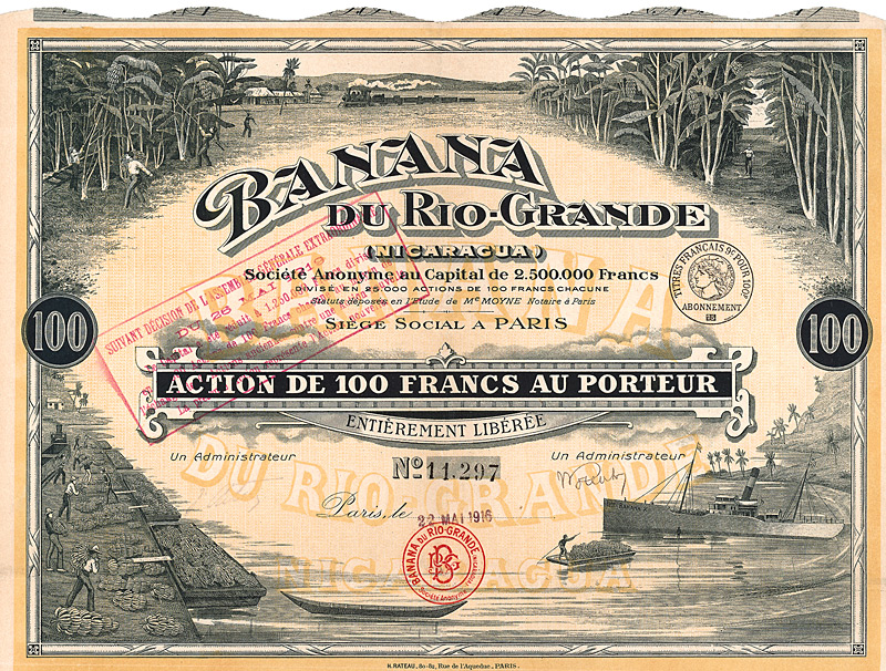 Gründeremission, Auflage 25.000. Hochdekorativ, ganzflächige Abb. mit Bananen-Plantagen, Eisenbahn und Bananendampfer. Maße: 23,4 x 31,9 cm. Mit anh. restlichen Kupons. Knickfalte am oberen Rand leicht eingerissen.