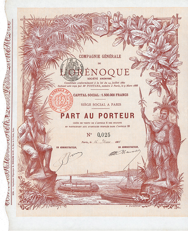 Gegründet bereits 1867 zum Betrieb von Kautschuk-Plantagen im Gebiet des Orinoko im heutigen Venezuela. Kunstvoll gestaltet von Fraipont mit Urwaldforscher, Palmen, Gummibaum, Indianer und Orinoko mit Raddampfer. Der belgische Maler und Graphiker Gustave Fraipont , 1849 in Brüssel geboren, wirkte hauptsächlich in Paris, wo er sich als Aquarellist betätigte. Auf vortreffliche Lithographien folgten dann Illustrationen zu Zeitschriften wie “Paris Illustré” und “Univers Illustré”, Umschlagzeichnungen, Plakate usw. Maße: 29,3 x 23 cm. Mit komplett anhängenden Kupons. Ein herrliches Papier!