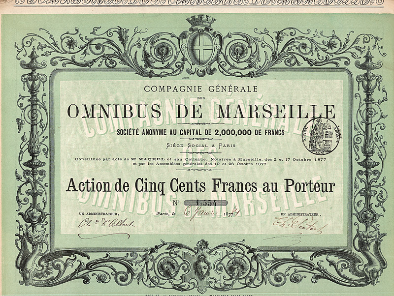 Gründung 1877. Betrieb von Omnibus- und Straßenbahn-Linien in Marseille. Sehr schöne Umrandung mit Fabelwesen. Maße: 22,6 x 30,3 cm. Rückseitig Statuten. Mit anhängenden restlichen Kupons.