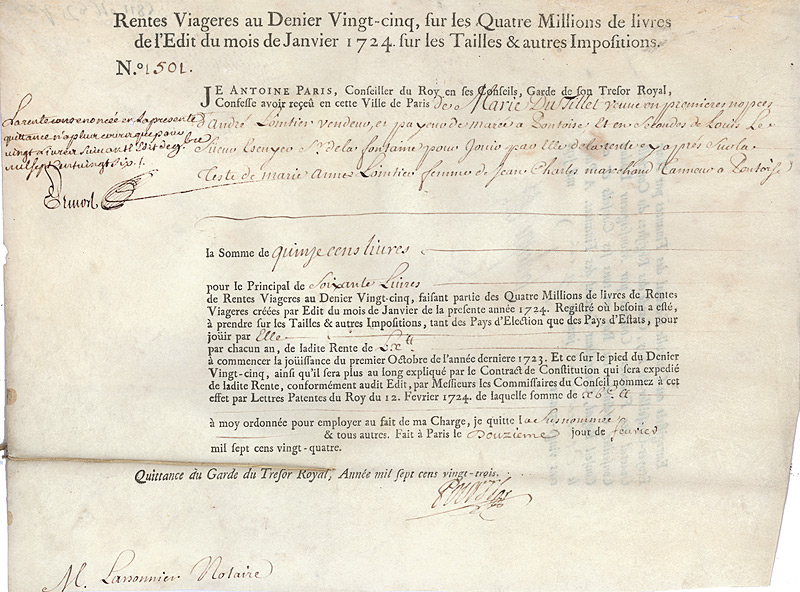 Rente Viagère (Denier 25), ausgefertigt auf Grundlage des königlichen Ediktes vom Januar 1724, Emissionsvolumen 4 Mio. Livres. Druck auf Tierhaut, handschriftlich ergänzt, original signiert von dem königlichen Schatzmeister Antoine Paris. Maße: 21,3 x 28,5 cm.