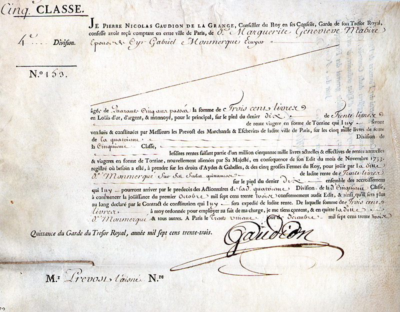 Shakespeare 331, R1. Nach dem Plan von Lorenzo Tonti (1630-1695) wurde eine neue Form von öffentlichen Anleihen erfunden. Tonti schlug die Aufnahme von Anleihen vor, zu deren Verzinsung die nach dem Lebensalter in 10 Gruppen eingeteilten Kapitalgeber Leibrenten in der Weise erhielten, dass die Rentenanteile der in jedem Jahr verstorbenen Gruppenmitgliedern den Ansprüchen der übrigen Mitglieder zugeschlagen wurden. Die Erlöse aus dieser Anleihe von 1733 dienten zur Finanzierung des Polnischen Thronfolgekrieges (1733 bis 1738). Die erste Tontine in Frankreich seit 1709, eingeteilt in 7 Klassen, im Gegensatz zu den damaligen 20 Klassen. Die Verzinsung variierte von 7,14285 % (1. Klasse, Denier 14, Alter bis zu 10 Jahre) bis 12,5 % (7. Klasse, Denier 8, Alter ab 60 Jahre). Druck auf Pergament, handschriftlich ergänzt, original signiert von dem königlichen Schatzmeister Pierre Nicolas Gaudion de la Grange. Maße:122 x 28,2 cm.