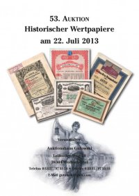 53. AUKTION Historischer Wertpapiere am 22. Juli 2013 Veranstalter: Auktionshaus Gutowski Leiferder Weg 19 38304 Wolfenbüttel Telefon 05331/975524 • Telefax 05331/975555 E-Mail gutowski@gmx.com