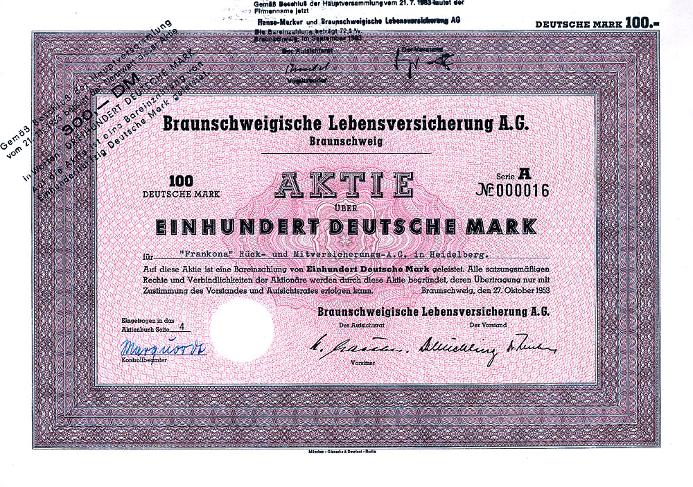 Nr. 854 Schätzpreis: 70,00 EUR Startpreis: 35,00 EUR A. Riebeck'sche Montanwerke AG Aktie 1.000 RM Nr. 1586 Frankfurt a.M., Febr. 1967 UNC Das von Kommerzienrat Riebeck begründete Unternehmen wurde 1883 im Zuge der Auseinandersetzung unter seinen Erben eine AG, 1888 übernahm ein Bankenkonsortium alle Aktien. Grundlage des Unternehmens waren Dutzende von Braunkohlengruben (teils Tiefbau, teils Tagebau) im Oberröblinger, Zeitz-Weissenfelser und im Halleschen Bezirk. 1923 weitere Ausdehnung des Bergwerksbesitzes mit dem Erwerb der Gewerkschaft Messel bei Darmstadt (1954 als "Paraffin- und Mineralölwerk Messel" ausgegliedert, 1959 an die schwedische Ytong AB verkauft; der ehemalige Braunkohlentagebau Grube Messel gehört heute übrigens als überragender Fossilien-Fundort zum Weltkulturerbe). Ebenfalls 1923 Übernahme wesentlicher Mineralöl-Interessen aus dem Stinnes-Einflussbereich, in diesem Zusammenhang für kurze Zeit Umfirmierung in "Hugo Stinnes-Riebeck Montan- und Oelwerke AG". 1926 Abschluss eines Interessenvertrages mit der I.G. Farbenindustrie AG, wonach jeder Aktionär seine Aktien 2:1 in I.G. Farben-Aktien tauschen konnte (diese Klausel war übrigens noch bis Ende der 80er Jahre Gegenstand vielbeachteter Prozesse zwischen beiden Gesellschaften). 1931 übernahmen die Rheinischen Stahlwerke ein großes Paket Riebeck-Aktien von der I. G. Farben und waren dann mit 87 % Mehrheitsaktionär. 1945 zu Gunsten des Landes Sachsen-Anhalt enteignet. Nach dem Krieg lagen neben geringfügigem Streubesitz die Riebeck-Aktien wieder bei I. G. Farben (rd. 50 %) und Rheinstahl (rd. 40 %). 1966 Sitzverlegung von Halle (Saale) nach Frankfurt (Main). Mit Restkupons. Immer noch gültiges Stück, kaum erhältlich. Nr. 855 Schätzpreis: 80,00 EUR Startpreis: 40,00 EUR Aachener Beschäftigungsinitiative AG VZ-Aktie 500 DM Nr. 10 (Muster) Aachen, Aug. 1998 UNC/EF Ganzflächiger Unterdruck mit der Stadt Aachen sowie farbige Bilder von arbeitenden Menschen. Seit Jahren nicht mehr angeboten. Nr. 856 Schätzpreis: 90,00 EUR Startpreis: 45,00 EUR Aachener Rückversicherungs-Ges. Namens-Aktie 50 DM Nr. 479335 Aachen, Dez. 1988 UNC/EF Gründung 1853 durch die Aachener und Münchener Feuer-Versicherung als älteste Rückversicherungs-Gesellschaft der Welt. Neben einer Mehrheitsbeteiligung an der Atlas Lebensversicherungs-AG in Ludwigshafen (Rhein) wurde 1938 fast die Hälfte des Kapitals der Volkshilfe Lebensversicherungs-AG in Berlin erworben. Nach Verkauf der Aktienmehrheit an eine US-Gesellschaft zunächst Umfirmierung in AM Konzern-Rückversicherung, 1997 ging der traditionsreiche Name durch Verschmelzung unter. Nr. 857 Schätzpreis: 60,00 EUR Startpreis: 30,00 EUR Aachener Tierpark AG Namensaktie 100 DM Nr. 2838 (Muster) Aachen, Juni 1970 UNC Gründeraktie. Der erste Tierpark in Aachen wurde bereits 1882 auf dem Gelände des heutigen Westparks angelegt. Zu geringe Besucherzahlen erzwangen 1905 die Schließung des ersten Aachener Zoos. Erst 1960 wurde der Gedanke wiederbelebt, indem 10 Aachener Bürger den "Verein der Tierparkfreunde" gründeten. 1966 wurde der neue Tierpark am Drimborner Wäldchen eröffnet, 1970 wurde die Trägerschaft auf eine neu gegründete AG übertragen. Vom Grundkapital von 267.000 DM hält weit über 90 % der Verein der Tierparkfreunde, daneben gibt es lediglich 45 freie Aktionäre (die ihre Aktien auch nicht verkaufen dürfen, sondern höchstens vererben). Kleine Vignette mit zwei Affen. Nr. 858 Schätzpreis: 100,00 EUR Startpreis: 50,00 EUR Aachener und Münchener Versicherung AG Namens-Aktie 50 DM Nr. 1369050 Aachen, Aug. 1979 UNC- Gründung 1825 als Aachener Feuer-Versicherungs-Gesellschaft. Als die Gesellschaft 1834 ihren Geschäftsbetrieb auf Bayern ausdehnte, regte König Ludwig I. persönlich die Umfirmierung in "Aachener und Münchener Feuer-Versicherung" an. Erst 136 Jahre später (1970) erneute Umfirmierung in Aachener und Münchener Versicherung AG und 1979 anläßlich der Neuordnung der Aachener und Münchener Gruppe in Aachener und Münchener Beteiligungs-AG. Nunmehr Holding für die ganze Gruppe, der Versicherungsbestand wurde auf die Cosmos Allgemeine Versicherungs-AG übertragen, die gleich im Anschluß neu als Aachener und Münchener Versicherung AG firmierte. 1998 erlangte im Zuge eines Ringtausches mit der Allianz und der französischen AGF die italienische Generali-Versicherung die Aktienmehrheit. 2001 in AMB Generali Holding AG umfirmiert. Nr. 859 Schätzpreis: 250,00 EUR Startpreis: 125,00 EUR Actien-Bauverein "Passage" (AG von 1870) Aktie 50 DM Nr. 5503 Berlin, Juni 1993 UNC Gültige Aktie! Kaiser Wilhelm I. persönlich eröffnete die 1870-73 errichtete "Kaisergalerie" zwischen dem Pracht-Boulevard Unter den Linden und der Friedrichstraße an seinem Geburtstag am 22.3.1873 (der Kaiser war auch Mitglied des ersten Aufsichtsrates). Erbaut im Renaissance-Stil mit Türmchen und Giebeln, 127 m lang, 8 m breit und 15 m hoch, war die Kaisergalerie "die" Besucher-Attraktion in Berlin. Wirtschaftlich war ihr zunächst nur mäßiger Erfolg beschieden: Imense Leerstände der Läden in der Passage und glücklose Ausflüge ins Hotel- und Restaurant-Geschäft brachten sie mehrfach an den Rand des Ruins - trotzdem sogar das Panoptikum und das Wachsfiguren-Kabinett der Brüder Castan als Mieter gewonnen werden konnten. Da die Gesellschaft bei Kriegsende einen schwedischen Großaktionär hatte (Svenska Tändsticks AB), überlebte sie sogar mehr oder weniger unbeschadet die DDR-Zeit und wurde 1991 wieder reaktiviert. Bis heute wird um die Rückgabe der wertvollen Grundstücke an der Friedrichstraße gestritten: Heute steht dort das Grand Hotel als Flaggschiff der ehemaligen Interhotel-Gruppe. In der Gestaltung an die Gründeraktie angelehnt. Die beiden Vignetten zeigen die Ecke Friedrichstr./Behrenstr. damals (mit dem Eingang der Kaisergalerie) und heute (mit dem Grand Hotel). Mit kpl. Kuponbogen. Seit Jahren nirgends mehr angeboten. Nr. 860 Schätzpreis: 50,00 EUR Startpre