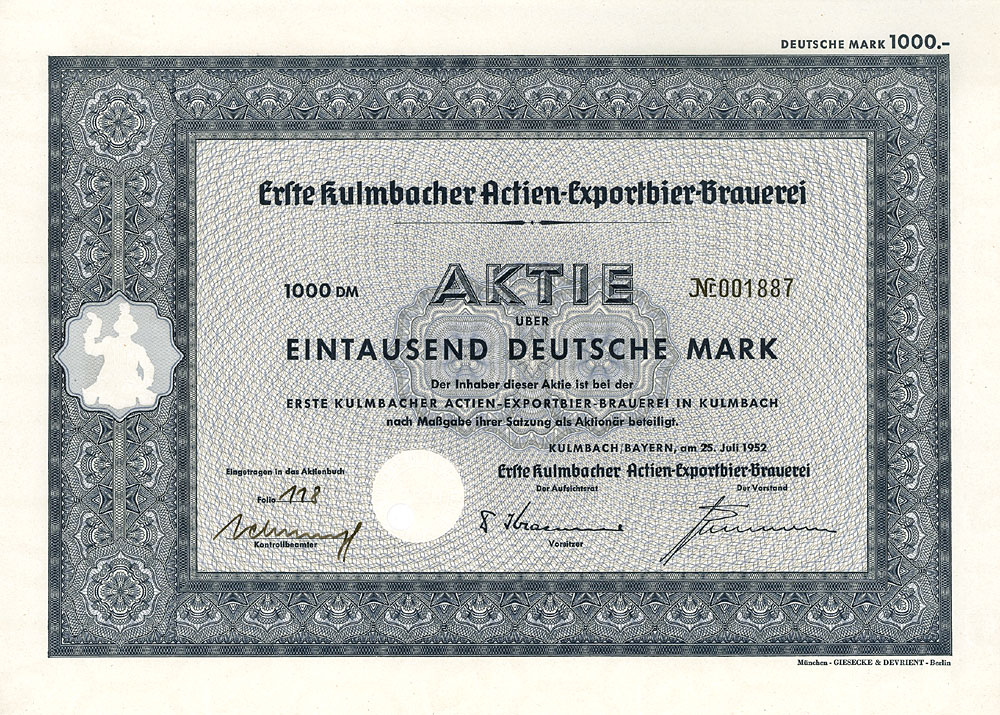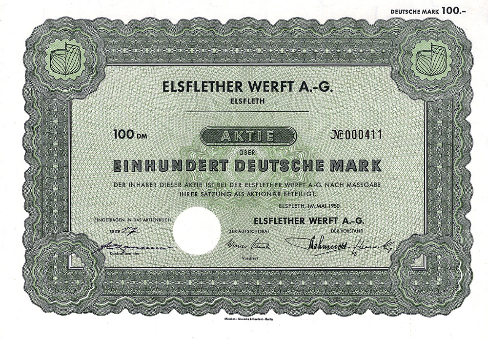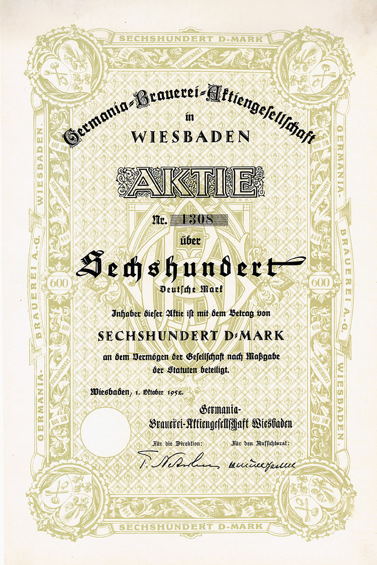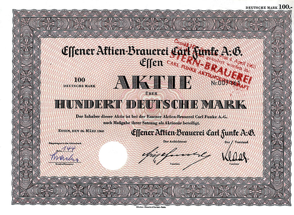 Nr. 974 Schätzpreis: 90,00 EUR Startpreis: 45,00 EUR Eduard Rheinberger AG Namensaktie 1.000 DM (Blankette) Pirmasens, Jan. 1962 UNC Gegründet bereits 1882, AG seit 1923. Hersteller von Damen- und Herrenschuhen in den Gruppen modisch, Sport, bequem und orthopädisch. Zweigniederlassung in Offenbach. 1950 wurde das Kapital umgestellt von 6 Mio. RM auf 6 Mio. DM. Seltener Lederwert. Nr. 975 Schätzpreis: 120,00 EUR Startpreis: 60,00 EUR Eichbaum-Brauereien AG Aktie 50 DM Nr. 28729 Worms, Jan. 1974 UNC/EF Gründung 1850 als "Brauerei zu den zwölf Aposteln". 1886 Umwandlung in die Werger Brauerei AG, gleichzeitig Übernahme der Binger Aktienbrauerei, der Elefantenbrauerei in Worms, der Schwetzinger Brauerei "Zum Zähringer Löwen" und der Brauerei Karl Fay GmbH in Darmstadt. 1923 Überkreuz-Beteiligungen mit der Brauerei-Gesellschaft Eichbaum in Mannheim und der Frankenthaler Brauhaus AG. 1929 Fusion zur in Eichbaum-Werger-Brauereien AG. Übernahme von Mehrheitsbeteiligungen 1967/68 bei der Brauerei Schwartz-Storchen AG, Speyer (1969 stillgelegt) und 1971/72 bei der Aktienbrauerei-Bürgerbräu AG, Ludwigshafen. 1972 Umfirmierung in Eichbaum-Brauereien AG, 1973 Aufnahme der Brauerei Durlacher Hof AG in Mannheim durch Verschmelzung, 1978 Sitzverlegung von Worms nach Mannheim. Lange Zeit in Frankfurt börsennotiert, heute besitzt die ACTRIS AG (früher: Henninger Bräu AG) 100 % der Aktien. Vignette mit einer alten Eiche als Firmenlogo. Prägesiegel lochentwertet. Nr. 976 Schätzpreis: 70,00 EUR Startpreis: 35,00 EUR Einbecker Brauhaus AG Aktie 50 DM Nr. 22762 Einbeck, Febr. 1972 UNC/EF Bereits seit 1794 begründete die Städtische Gemeinschaftsbrauerei den Ruf des Einbecker Bieres, das damals zu den bekanntesten in ganz Deutschland zählte. 1889 Umwandlung in die "Dampfbierbrauerei der Stadt Einbeck AG". 1921/22 Fusion durch Aktienumtausch 1:1 mit der Hildesheimer Aktienbrauerei (vormals Brauerei Feustel, AG seit 1890) unter deren Namen, seitdem Sitz in Hildesheim. 1967 Umfirmierung in "Einbecker Brauhaus AG" und Rückverlegung des Sitzes nach Einbeck. Rückseitig Entwertungsstempel. Nr. 977 Schätzpreis: 70,00 EUR Startpreis: 35,00 EUR Eisen- und Hüttenwerke AG Aktie 100 DM Nr. 1021 Köln, Aug. 1969 EF+ Gründung 1918 in Harburg als "Securitas-Werke AG für Schiffs- und Maschinenbau und Sprengstofffabrikation". 1919 Sitzverlegung nach Bochum, 1921 Umfirmierung wie oben, 1940 Sitzverlegung nach Köln. 1940 Angliederung der Eisenhüttenwerk Thale AG (die nach der Wende 1989 der frühere niedersächsische Ministerpräsident Ernst Albrecht auf Vordermann brachte) und der Rasselsteiner Eisenwerksgesellschaft. Größte Beteiligungen sind heute die Rasselstein GmbH in Neuwied (Erzeugung von Weiß- und Feinblech) und die Stahlwerke Bochum AG. Gehörte lange zum Otto-Wolff-Konzern, später kam Thyssen als Aktionär dazu, heute besitzt die Thyssen Krupp Steel AG 88 % der Aktien der noch immer börsennotierten AG. Prägesiegel lochentwertet. Nr. 978 Schätzpreis: 70,00 EUR Startpreis: 35,00 EUR Eisenwerk Wülfel Aktie 1.000 DM Nr. 5642 Hannover-Wülfel, Mai 1952 EF Gründung 1882 als "Hannoversche Messing- und Eisenwerke", 1893 Umbenennung in Eisenwerk Wülfel. Innerhalb von 20 Jahren entwickelte sich die Firma zum größten Transmissions-Werk in Europa. Nach 1945 wurden produziert: Transmissionsanlagen, Gleitlager, Kupplungen, Zahnradgetriebe, Erdölfeld-Einrichtungen, Gießerei-Anlagen sowie Schleif- und Poliermaschinen. 1975 Produktionseinstellung, Teile des Produktionsprogramms und der Werke wurden von der MAN-Tochter Zahnräderfabrik RENK AG in Augsburg (als Zweigwerk Hannover) und der Roland Offsetmaschinenfabrik Faber & Schleicher AG in Offenbach (heute MAN Roland) übernommen. Seit 1977 in Konkurs. Unentwertet Nr. 979 Schätzpreis: 160,00 EUR Startpreis: 80,00 EUR Elbschloss-Brauerei Aktie 100 DM Nr. 22195 Hamburg-Nienstedten, April 1967 UNC/EF Auflage 500. Schon 1881 wurde die Brauerei an der Elbchaussee 155 gegründet. 1918 wurde die benachbarte Exportbrauerei Teufelsbrücke AG in Klein-Flottbek angegliedert (1919/20 stillgelegt). 1980 Umbenennung in Elbschloss-Brauerei AG. 1993 Eingliederung in den Brau und Brunnen-Konzern. 1994 wurde der Brauereibetrieb auf die Elbschloss-Brauerei GmbH übertragen, die AG blieb Besitzgesellschaft des Betriebsanwesens. 1996 wurde die Elbschloss-Brauerei GmbH in die ebenfalls zu Brau und Brunnen gehörende Bavaria-St. Pauli-Brauerei AG integriert. Als 1997 Brau und Brunnen die Braustätte Hamburg schließen wollte, erwarb 1998 nach massiven Protesten die Freie und Hansestadt Hamburg die Bavaria-St. Pauli-Brauerei GmbH und verkaufte sie bald darauf an die Holsten-Brauerei AG weiter. Kaum zu beschaffen! Mit Kuponbogen (Kupons Nr. 33-50). Rückseitig Entwertungsstempel. Nr. 980 Schätzpreis: 160,00 EUR Startpreis: 80,00 EUR Elbschloss-Brauerei Aktie 50 DM Nr. 31570 Hamburg-Nienstedten, April 1967 UNC- Auflage: 2000. Mit Kuponbogen. Rückseitig Entwertungsstempel. ![]() Nr. 981 Schätzpreis: 90,00 EUR Startpreis: 45,00 EUR Elsflether Werft AG Aktie 100 DM Nr. 411 Elsfleth, Mai 1950 EF Auflage: 500. Gegründet wurde die zwischen dem Elsflether Tidehafen und der alten Weser gelegene Werft 1916 unter Führung des Schiffsbauingenieurs Franz Peuss und der Oldenburger Spar- und Leihbank. Zunächst waren Binnentanker eine besondere Spezialität, im 2. Weltkrieg baute die Werft dann Minensuchboote und Tankschiffe. Nach dem Krieg wurde 1952 wieder der erste Neubau abgeliefert, zuletzt konnten nach ständigen Erweiterungen der Werft Schiffe bis 20.000 tdw gebaut werden. Börsennotiert früher in Hamburg, nach dem Krieg in Bremen, Großaktionär war die Bremer Lürssen-Werft. 1994 im großen Werften-Sterben in Konkurs gegangen, aber dennoch nicht ganz am Ende: als Reparaturwerft konnte sich das Unternehmen, nunmehr als GmbH & Co. KG, bis in unsere Tage retten. Mit restlichem Kuponbogen, unentwertet. Nr. 982 Schätzpreis: 100,00 EUR Startpreis: 50,00 EUR Erms-Neckar-Bahn 