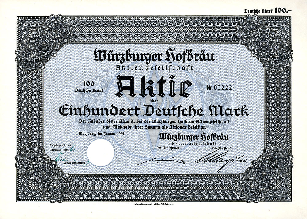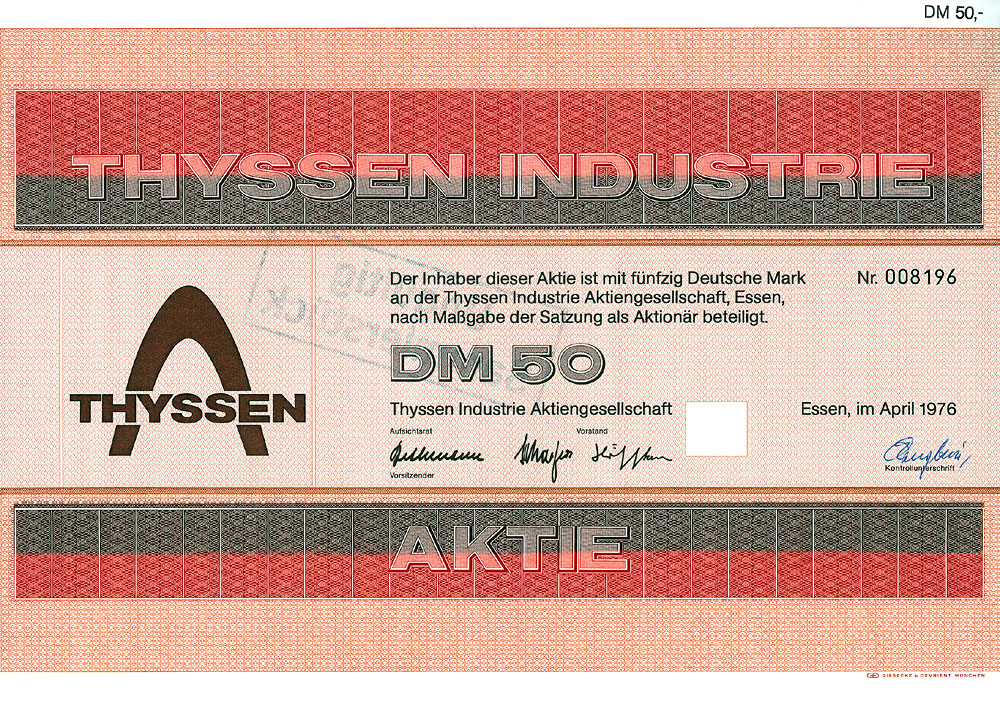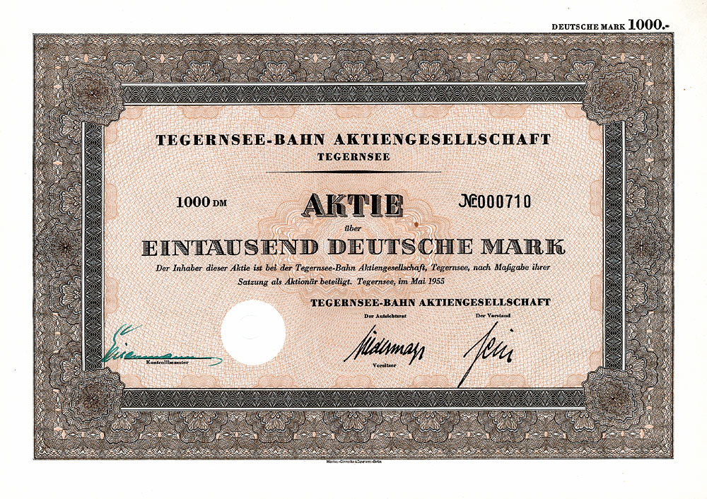 Nr. 1097 Schätzpreis: 150,00 EUR Startpreis: 75,00 EUR Nassauische Kleinbahn AG Aktie 100 DM Nr. 282 Wiesbaden, Febr. 1953 EF+ Auflage 500. Gründung 1898. Sitz bis 1942 in Berlin-Wilmersdorf. 1000-mm-Schmalspurbahnen St. Goarshausen-Nastätten-Zollhaus (43 km), Nastätten-Miehlen (4 km) und Braubach Hafen zur Blei- und Silberhütte (2 km als Dreischienengleis in 1000- und 750-mm-Spur). 1952-77 schrittweise stillgelegt. 1975 in eine GmbH umgewandelt. Mit restlichem Kuponbogen, unentwertet. Nr. 1098 Schätzpreis: 100,00 EUR Startpreis: 50,00 EUR Neckermann Versand-AG Aktie 50 DM (Blankette) Frankfurt/Main, Juni 1977 UNC/EF Gründung 1948 als Textilgeschäft Neckermann KG, 1963 Umgründung in eine KGaA. Im gleichen Jahr wird der Fertighausvertrieb und der Reisedienst (später Neckermann und Reisen N-U-R) aufgenommen. 1976 erwirbt die Karstadt AG eine Schachtelbeteiligung, 1977 Sanierung des schwer angeschlagenen Unternehmens, 1984 Eingliederung in die Karstadt AG. Was bleibt, ist die beispiellose unternehmerische Leistung von Josef Neckermann, der im deutschen Versandhandel allein auf einen Marktanteil von 10 % kam. Sehr dekorativ, mit großer Ansicht des damals gerade neuerbauten Versandzentrums. Lochentwertet. Äußerst selten. Nr. 1099 Schätzpreis: 80,00 EUR Startpreis: 40,00 EUR Nestlé Deutschland AG Sammelaktie 20 x 50 DM Nr. 68761-80 Frankfurt a.M., Sept. 1987 UNC/EF Gründeraktie. Gründung 1987 zur Bündelung der deutschen Interessen der Schweizer Nestlé S.A. Mit fast 3 Mrd. DM Jahresumsatz und über 12.000 Beschäftigten einer der größten Lebensmittelkonzerne. Tochterfirmen sind u.a. Allgäuer Alpenmilch, Libby, Thomy, Friskies, Herta, Maggi, Rowntree Mackingtosh, Nestlé-Alete und Warncke-Eiskrem. Mit dem bekannten Nestlé-Markenzeichen. Prägesiegel lochentwertet. Bis auf ganz wenige Erinnerungsstücke wurde die gesamte Auflage vernichtet. Nr. 1100 Schätzpreis: 120,00 EUR Startpreis: 60,00 EUR Nordcement AG Aktie 1.000 DM Nr. 4763 Hannover, Juli 1964 UNC/EF Gründung 1898 als Norddeutsche Portland-Cement-Fabrik Misburg. Später kontinuierliche Expansion durch Aufkauf von Konkurrenten: Misburger Portland-Cement-Fabrik Kronsberg AG (1904), Wunstorfer Portlandcementwerke AG (1929), Portland Alemannia AG in Hannover und Portlandcementwerk Schwanebeck AG (1930), Portlandcementfabrik Hoiersdorf GmbH, Portlandzementwerk "Siegfried" Salzderhelden AG und Vorwohler Portland-Cement-Fabrik AG, Hannover (1942). Alle diese Beteiligungen sowie die Braunschweiger Portlandcementwerk AG, Salder wurden 1950/57 auf die Nordcement verschmolzen. 1964 Umfirmierung in NORDCEMENT AG (und kompletter Neudruck der Aktien). 1973/75 Erwerb und anschließende Verschmelzung der Portland-Cementfabrik Hardegsen AG. In Betrieb blieben die Werke Höver (Werk Alemannia), Hardegsen und Wunstorf. Verschmelzung mit der Alsen GmbH und der Breitenburger Finanzholding GmbH auf die Breitenburger Portland-Cement-Fabrik und Umbenennung in Alsen AG. Rückseitig Entwertungsstempel. Sehr selten. Nr. 1101 Schätzpreis: 100,00 EUR Startpreis: 50,00 EUR Norddeutsche Chemische Fabrik in Harburg Aktie 700 DM Nr. 51 Hamburg, Mai 1962 UNC Auflage: 1000. Gründung 1888. Die Fabrik in Harburg (Seevestr. 13) produzierte speziell Schwefelsäure, schwefelsaure Tonerde, Schwefelnatrium, Antichlor, Glaubersalz und Salzsäure. 1916 wurde die Saccharinfabrik vorm. Fahlberg, List & Co. in Magdeburg Alleinaktionär, 1924 gingen die Aktien auf die N.V. Oxyde Mij. voor Ertsen en Metalen in Amsterdam über, nach dem Krieg erwarb das Bankhaus Delbrück & Co., Berlin/Köln die Aktienmehrheit. 1967 wurde die Fabrik stillgelegt, 1983/84 ist die AG letztmals im Handbuch verzeichnet. Unentwertet. Äußerst selten angeboten! Nr. 1102 Schätzpreis: 70,00 EUR Startpreis: 35,00 EUR Norddeutsche Hochseefischerei AG Aktie 1.000 DM Nr. 1965 Bremerhaven, Juni 1965 UNC/EF Auflage: nur 500 Stück. Gründung 1907. 1935 Übernahme der Deutsche Fischerei AG. Die Fangflotte erreichte bis zum Kriegsbeginn 23 Schiffe. 1968 Übernahme der Bremen-Vegesacker Fischerei GmbH. 1970 Vercharterung der gesamten Flotte (15 Schiffe) an die Nordsee Deutsche Hochseefischerei GmbH. 1977 Rückzug aus dem Fischfanggeschäft. 1979 Umfirmierung in Project Carries AG und Sitzverlegung von Bremerhaven nach Leer/Ostfriesland. Seitdem Wahrnehmung von Geschäftsführungsaufgaben als Komplementär für Reedereien des neuen Schiffstyps Project Carrier. 1982 Sitzverlegung nach Bad Schwartau. 1985 Umbenennung in Hansa-Linie AG und Sitzverlegung nach Bremen, 1989 Umbenennung in MAMMOET-HANSA-Linie AG, 1994 Sitzverlegung nach Rostock, seit 1995 als Reederei Hansa AG firmierend. G&D-Druck mit farbiger Reederei-Flagge. Vorderseitig Entwertungsstempel laut Beschluß vom 22.12.1988. Nr. 1103 Schätzpreis: 90,00 EUR Startpreis: 45,00 EUR Norddeutsche Lederwerke AG Aktie 100 DM Nr. 20445 Hamburg, Aug. 1960 EF+ 1872 in Straßburg (Elsass) unter der Firma Adler & Oppenheimer als Ledergroßhandlung gegründet, ab 1900 AG. Herstellung von Chromoberleder, Lederriemen sowie Rahmenfabrikation. 1918 (die Firma hatte inzwischen 2500 Mitarbeiter) beschlagnahmten die Franzosen das Werk. Deshalb 1920 Sitzverlegung nach Berlin und Neubau von Fabriken in Neustadt-Glewe/Mecklenb. (1946 enteignet) und Neumünster. Die in Berlin und Frankfurt börsennotierte AG wurde 1938/40 unter persönlicher Mitwirkung des Deutsche-Bank-Vorstands Hermann J. Abs "arisiert". 1946 pachtweise Übernahme einer Gerberei bei Bonn, 1949 Sitzverlegung nach Hamburg. 1951 gütliche Einigung mit den jüdischen Altaktionären Adler und Oppenheimer über eine Restitution - der AR-Vorsitzende Hermann J. Abs blieb weiter im Amt. Mit restlichem Kuponbogen, unentwertet. Äußerst selten angeboten! Nr. 1104 Schätzpreis: 90,00 EUR Startpreis: 45,00 EUR Nordstern Allgemeine Versicherungs-AG Namens-Aktie 100 DM Nr. 258700 Köln und Berlin, Jan. 1974 UNC- Gründung 1866 in Berlin als Preußische Feuer-Versicherungs-AG. Umbenannt 1914 in Nordstern-P