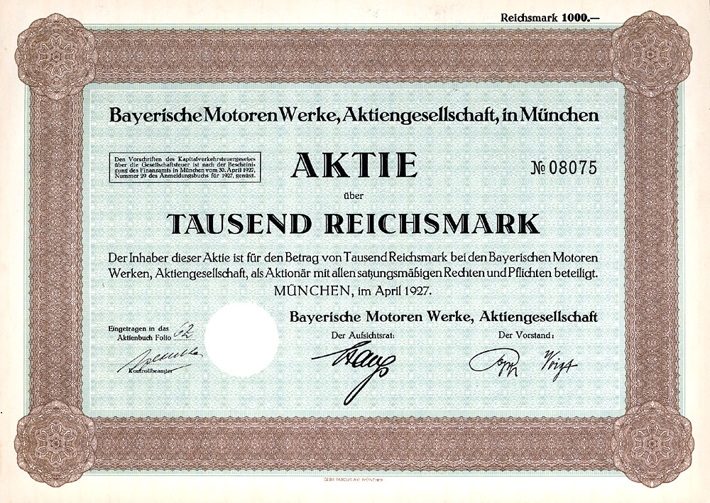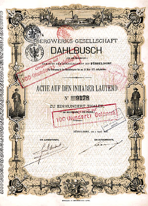 Schweizer Insolvenz-Versteigerung 1. Teil Deutschland Nr. 334 Schätzpreis: 300,00 EUR Startpreis: 1,00 EUR Actien-Zucker-Fabrik Stendal Actie 1.250 Mark Nr. 455 Stendal, 15.6.1892 VF- Gründeremission, Auflage: 850. Aktionär durfte nur werden, der die Landwirtschaft als Eigentümer oder Pächter betrieb und nicht Mitglied einer anderen Zuckerfabrik war. Originalunterschriften u.a. vom Vorsitzenden des Aufsichtsrats von Bismarck vorderseitig und bei den Übertragungsvermerken auf der Rückseite. Nr. 335 Schätzpreis: 200,00 EUR Startpreis: 1,00 EUR Actien-Zuckerfabrik Marienstuhl Actie 300 Mark Nr. 989 (Auflage 1500) Egeln, 1.11.1887/15.6.1904 EF Gründung bereits 1847. Einrichtung des Werkes von der Fürstlich Stolbergsche Maschinen-Fabrik, Umbau 1914. Nr. 336 Schätzpreis: 200,00 EUR Startpreis: 1,00 EUR AG für Glasindustrie vorm. Friedr. Siemens Aktie 1.000 Mark Nr. 7313 Dresden, Okt. 1888 VF- Gründeraktie, Auflage: 9.000. Gründung 1888 als AG für Glasindustrie vorm. Friedr. Siemens unter Übernahme der 1862 errichteten Flaschenfabrik von Friedr. Siemens in Dresden. Später Übernahme weiterer Fabriken in Döhlen, Neusattl, Kosten (1890), Schneidemühl (1900), Wirges, Osterwald, Gertraudenhütte (1902), Graz (1911) und Gleiwitz (1912). So entstand einer der größten Erzeuger von Flaschen und Weißhohlglas in ganz Europa. 1930 Verschmelzung mit der Stralauer Glasfabrik AG in Berlin. Ab 1943 Siemens-Glas AG, 1948/49 Sitzverlegung in das einzige im Westen gelegene Werk Wirges/Westerwald (Glasfabrik, Schamottefabrik, Porzellanfabrik, Wandler- und Transformatorenwerk). Ohne Lochentwertung! Nr. 337 Schätzpreis: 125,00 EUR Startpreis: 1,00 EUR AG für Metall-Industrie vormals Gustav Richter Aktie 1.000 Mark Nr. 3427 Karlsruhe, 11.11.1922 EF+ Gründung 1899 in Pforzheim zwecks Fortführung des Betriebes der Fa. Gustav Richter Tubenfabrik. Herstellung von Tuben, Tubenhütchen, Spritzkorken und Dosen. 1920 Sitzverlegung nach Karlsruhe. Doppelblatt. Ohne Lochentwertung! Nr. 338 Schätzpreis: 300,00 EUR Startpreis: 1,00 EUR AG für Metallindustrie vormals Gustav Richter Actie 1.000 Mark Nr. 548 Pforzheim, 8.7.1907 EF Auflage: 300. Äußerst dekorativer, großformatiger Druck. Doppelblatt. Nr. 339 Schätzpreis: 150,00 EUR Startpreis: 1,00 EUR AG Portland-Cementwerk Berka a.Ilm Aktie 1.000 Mark Nr. 6 Berka a. Ilm, 5.7.1901 EF/VF Gründeraktie, Auflage: 1100. Gründung 1901. Neben dem Portland-Zementwerk nahe dem Haltepunkt Schloßberg der Thüringischen Eisenbahn-AG betrieb die Ges. auch eine Ueberlandzentrale und versorgte den bekannten Kurort Bad Berka bei Weimar mit elektrischer Energie. Zu DDR-Zeiten war in den Fabrikanlagen zuletzt ein Dämmstoffwerk. Sehr schöne Jugendstil-Gestaltung. Froher Mehrfarbendruck. Original signiert. Nr. 340 Schätzpreis: 50,00 EUR Startpreis: 1,00 EUR Allgemeine Elektricitäts-Gesellschaft Anteil 10 RM Nr. 29816 Berlin, Jan. 1925 EF+ Gründung 1883 durch Emil Rathenau als "Deutsche Edison-Gesellschaft für angewandte Elektricität", 1887 Umfirmierung in AEG. Beim Besuch der Weltausstellung in Philadelphia lernte Emil Rathenau die epochemachenden Erfindungen von Thomas A. Edison kennen. Es gelang ihm, die Patente für Deutschland zu erwerben. Zu Recht wird Rathenau als der Begründer der elektrischen Großindustrie in Deutschland bezeichnet. Was mit der Herstellung von Glühlampen begann, entwickelte sich bald zu einem Unternehmen, das auf allen Gebieten der Starkstromtechnik und den benachbarten Gebieten des Schwachstroms eine führende Rolle spielte - lange blieb der Wettstreit mit Siemens & Halske um den ersten Platz unentschieden. Der unaufhaltsame Niedergang nach dem 2. Weltkrieg fand jetzt mit der Auflösung der AEG durch den Daimler-Benz-Konzern sein trauriges Ende. Nr. 341 Schätzpreis: 125,00 EUR Startpreis: 1,00 EUR Annawerk Schamotte- und Tonwarenfabrik Aktie Lit. B 100 RM Nr. 514 Oeslau bei Coburg, 1.6.1935 EF Auflage: unter 500! Gründung 1899 unter Übernahme der seit 1857 bestehenden Firma J.R. Geith. Herstellung von Schamotte, Porzellan und Steingut für sanitäre Spülwaren, Steinzeugtöpfe und -röhren, Dachziegeln, Klinkern und Leichtbauplatten. Börsennotiz Leipzig, Berlin und Frankfurt. Großaktionär: Deutsche Steinzeug, Mannheim-Friedrichsfeld (heute Friatec). Nicht ohne Ironie ist eine Meldung im Jahr 1939: "Ein Teil der Fabrik für feuerfeste Erzeugnisse (ausgerechnet!) durch Brandunglück vernichtet." Ohne Lochentwertung! Nr. 342 Schätzpreis: 125,00 EUR Startpreis: 1,00 EUR Annawerk Schamotte- und Tonwarenfabrik Aktie 1.000 RM Nr. 1117 Oeslau bei Coburg, Jan. 1938 UNC Ohne Lochentwertung! Nr. 343 Schätzpreis: 120,00 EUR Startpreis: 1,00 EUR Annawerk Schamotte- und Tonwarenfabrik Aktie 1.000 RM Nr. 1809 Oeslau bei Coburg, 3.10.1941 EF Nr. 344 Schätzpreis: 150,00 EUR Startpreis: 1,00 EUR Anton & Alfred Lehmann AG Aktie 1.000 Mark Nr. 6163 Berlin, Juli 1922 EF Gründung 1891. Erwerb und Betrieb von Anlagen der Textilindustrie aller Art, Handel mit Rohstoffen und Fabrikaten, speziell mit Plüschen für Spielwaren und Trikotfabrikaten. Fabriken in Berlin-Niederschöneweide und Katscher (O.S.). Börsennotiz Berlin. 1940 nach Abschluss der Abwicklung gelöscht. Sehr schöner G&D-Druck mit Hermes-Kopf im Unterdruck. Nr. 345 Schätzpreis: 450,00 EUR Startpreis: 1,00 EUR Aschersleben-Schneidlingen-Nienhagener Kleinbahn-AG Actie 1.000 Mark Nr. 871 Aschersleben, 2.1.1897 VF Gründung am 24.9.1895. Betriebseröffnung am 1.4.1897. 1904 Sitzverlegung von Aschersleben nach Berlin. Normalspurige, 46 km lange Strecke. Die Bahn besaß 9 Lokomotiven, nur 7 Personen- aber 164 Güterwagen. Kein Wunder: zu den maßgeblichen Gründern gehörten zwei Braunkohlengruben der Gegend. Dekorative Umrandung im Historismus-Stil. Original signiert. Rostflecke, rechter Rand etwas gestaucht, Knickfalte am Rand eingerissen. Doppelblatt. Nr. 346 Schätzpreis: 125,00 EUR Startpreis: 1,00 EUR Atlas Levante-Linie Aktie 1.000 RM Nr. 1546 Bremen, Aug. 1935 EF+ Gründerakt