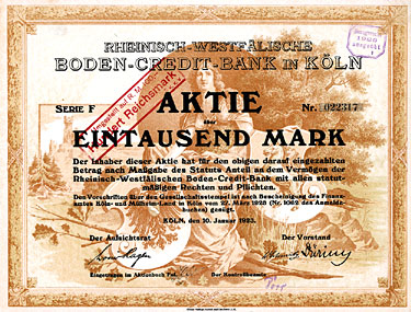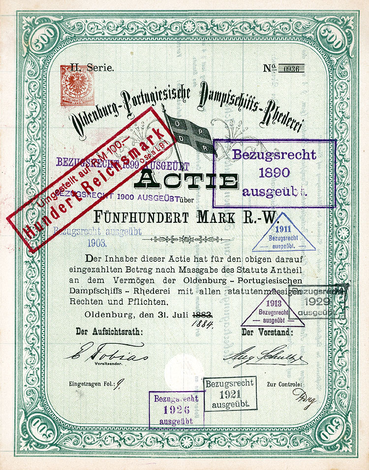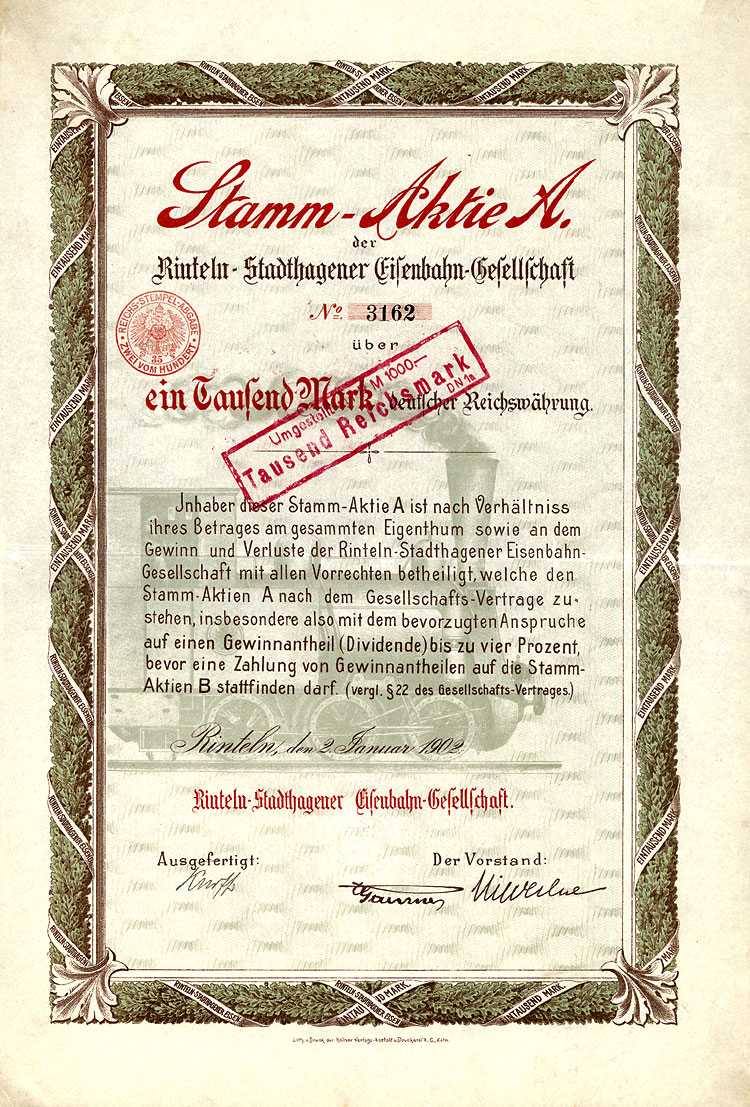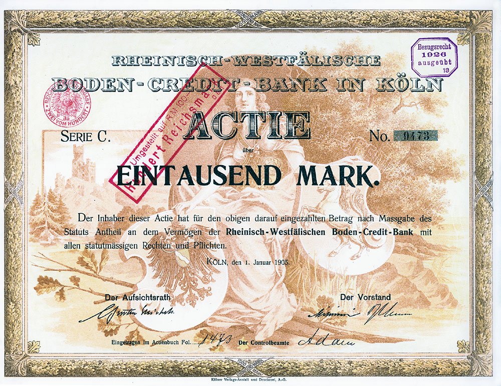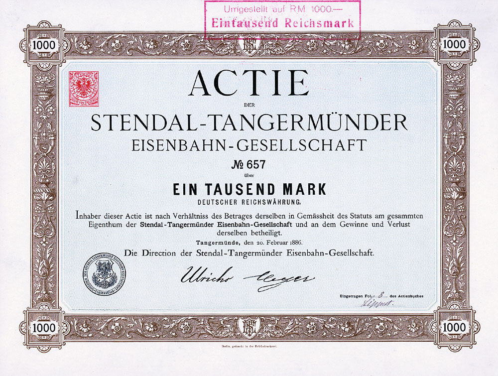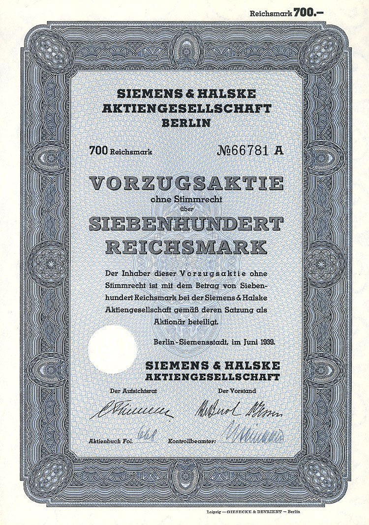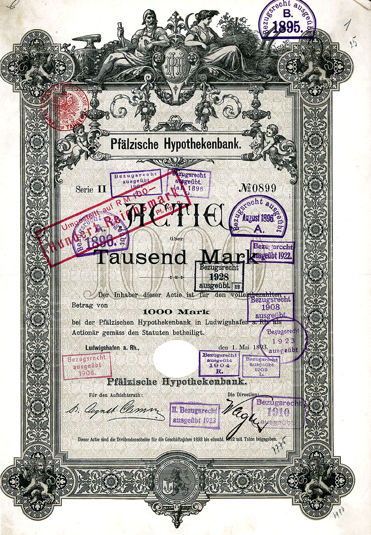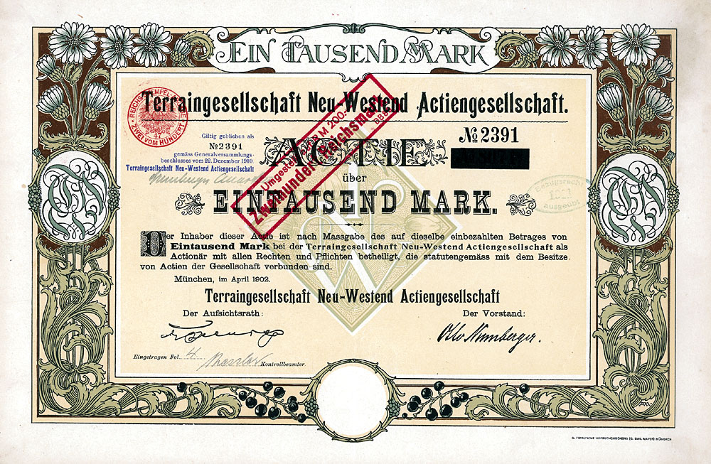 Nr. 433 Schätzpreis: 150,00 EUR Startpreis: 1,00 EUR Lederer-Bräu AG Aktie 100 RM Nr. 4031 Nürnberg, Jan. 1930 EF Auflage 2250, kompletter Aktienneudruck. Die Braustätte in der Bärenschanzstr. 48 existiert schon seit 1575, im Jahr 1890 von der Bierbrauereigesellschaft vormals Gebrüder Lederer AG übernommen. 1928 Umfirmierung in Lederer-Bräu AG. 1919/20 Lohnsudvertrag mit der Genossenschaftsbrauerei für Nürnberg, Fürth und Umgebung. Ferner übernommen die Brauerei Güttinger in Lauf (1921), die Brauereien Finkler & Lehner in Gunzenhausen (1922), die Brauerei Schübel in Rückersdorf (1924), die Brauerei Gloßner in Wengen (1927), die Brauerei Dietrich Müller in Hersbruck (1929) sowie nach und nach die Brauerei Humbser-Geismann AG in Fürth. 52 eigene Wirtschaften. 1972 Mega-Fusion mit sechs weiteren Brauereien zur Patrizier-Bräu AG. Nr. 434 Schätzpreis: 125,00 EUR Startpreis: 1,00 EUR Lippische Werkstätten AG Aktie 1.000 Mark Nr. 5678 Detmold, 18.12.1920 VF- Auflage: 2500. Gründung 1916 als "Fürstlich Lippische Staatswerkstätten AG". 1920 Umfirmierung in Lippische Werkstätten AG, Name ab 1922 Lippische Werke AG. Seit 1921 Fabrikation von Lastautomobilen, Kleinkrafträdern, Lastanhängern und Holzbearbeitungsmaschinen, außerdem Möbelfabrik und Waggonwerk. 1928 in Liquidation. Gänzlich anders gestaltet als die früheren und späteren Emissionen. Nr. 435 Schätzpreis: 200,00 EUR Startpreis: 1,00 EUR Lippische Werkstätten AG Aktie 1.000 Mark Nr. 6186 Detmold, 1.11.1921 EF Auflage: 5000. Äußerst dekoratives Stück, Abb. zweier Schmiede bei der Arbeit. Nr. 436 Schätzpreis: 200,00 EUR Startpreis: 1,00 EUR Lippische Werkstätten AG Aktie 1.000 Mark Nr. 11031 Detmold, 1.2.1922 EF Auflage: 7000. Äußerst dekoratives Stück, ebenfalls mit Abb. zweier Schmiede bei der Arbeit. Nr. 437 Schätzpreis: 175,00 EUR Startpreis: 1,00 EUR Maschinen- und Fahrzeug-Fabriken Alfeld-Delligsen AG Aktie 100 RM Nr. 14 Alfeld-Leine, Aug. 1929 EF Gründung 1899 als "Bernburger Maschinenfabrik", Sitzverlegung nach Alfeld (1915) bzw. Hannover (1923) und Umfirmierung wie oben. Fabrikationsprogramm: Maschinen für die Papier- und Chemieindustrie, Herde, Öfen, Waggons. Börsennotiz Hannover und Berlin. 1931 Konkurs. 1933 wurde als Nachfolgegesellschaft die Herdfabrik Delligsen AG gegründet. Nr. 438 Schätzpreis: 200,00 EUR Startpreis: 1,00 EUR Maschinenbau-Anstalt Humboldt Aktie 100 RM Nr. 10265 Köln, März 1927 EF Gegr. 1856 (Maschinenfabrik für den Bergbau "Sivers & Co."), seit 1884 Maschinenbau-Anstalt Humboldt, Köln-Kalk. 1930 Fusion mit der Motorenfabrik Deutz AG (gegründet 1864 von N. A. Otto und E. Langen als erste Motorenfabrik der Welt) und der Motorenfabrik Oberursel AG zur Humboldt-Deutzmotoren-AG. 1936 Übernahme der Magirus AG in Ulm (gegr. 1864 als Spezialfabrik für Feuerwehrgeräte, ab 1918 auch Fahrzeugbau). 1938 Interessengemeinschaft mit der Klöckner-Werke AG in Duisburg und Umfirmierung in Klöckner-Humboldt-Deutz AG. Übernahme der Vereinigte Westdeutsche Waggonfabriken AG (1959), der Maschinenfabrik Fahr AG, Gottmadingen (1961) und der WEDAG Westfalia Dinnendahl Gröppel AG, Bochum (1969). Die 1974 begonnene Kooperation mit FIAT bei Nutzfahrzeugen führte 1975 zur Gründung des Gemeinschaftsunternehmens IVECO (1982 ganz an FIAT übergegangen). Neben Motoren wurden Gasturbinen, Luftfahrtantriebe, Traktoren, Mähdrescher und Industrieanlagen hergestellt. Nach einer existenzbedrohenden Krise in den 90er Jahre blieb der bis heute börsennotierten KHD nur noch das Motorenwerk in Köln-Deutz. Nr. 439 Schätzpreis: 200,00 EUR Startpreis: 1,00 EUR Maschinenbau-Anstalt Humboldt Aktie 100 RM Nr. 20063 Köln-Kalk, Febr. 1928 EF- Nr. 440 Schätzpreis: 200,00 EUR Startpreis: 1,00 EUR Maschinenbau-Anstalt Humboldt Aktie 1.000 RM Febr. 1928, Nr. 2027 Köln-Kalk, Febr. 1928 EF Nr. 441 Schätzpreis: 125,00 EUR Startpreis: 1,00 EUR Maschinenbaugesellschaft Karlsruhe Aktie 100 RM Nr. 23838 Karlsruhe, Okt. 1927 UNC Gründung 1852. Eisen- und Metallgiesserei, Kesselschmiede. Bis 1929 auch Lokomotivbau (verkauft an die Hohenzollern AG in Düsseldorf). Börsennotiz Berlin, Frankfurt und Mannheim. Ungewöhnliche Gestaltung mit stilisierter Werksansicht. Ohne Lochentwertung! Nr. 442 Schätzpreis: 375,00 EUR Startpreis: 1,00 EUR Maschinenfabrik Augsburg-Nürnberg Aktie 1.000 Mark Nr. 11136 Augsburg, 10.3.1914 VF Auflage: 9000. Gründung 1898 unter Vereinigung der Maschinenfabrik Augsburg (gegr. 1840) und der Maschinenbau Nürnberg (gegr. 1841). 1915 Übernahme der LKW-Produktion von Saurer/Lindau. 1986 Verschmelzung der MAN Maschinenfabrik Augsburg-Nürnberg AG auf die Gutehoffnungshütte Aktienverein AG und Umfirmierung in MAN AG. Noch heute einer der bedeutendsten Konzerne im Maschinen-, Anlagen- und Fahrzeugbau und der Luft- und Raumfahrttechnik. Einer der 30 DAX-Werte. Doppelblatt. Nr. 443 Schätzpreis: 225,00 EUR Startpreis: 1,00 EUR Maschinenfabrik Augsburg-Nürnberg AG Aktie 1.000 Mark Nr. 35724 Augsburg, Jan. 1920 VF+ Hochformat, sehr hübscher Druck mit Firmensignet und den Stadtwappen von Augsburg und Nürnberg in der Umrahmung. Eingerissene Mittelfalte fachgerecht restauriert. Nr. 444 Schätzpreis: 150,00 EUR Startpreis: 1,00 EUR Mitteleuropäische Versicherungs-AG Namens-Aktie 1.000 Mark Nr. 2764 Köln, Juni 1921 VF+ Auflage: 1000. Gründung 1917. Gehörte zur Agrippina-Versicherungsgruppe. Schöner Druck. Linker Rand mit Roststelle. Doppelblatt. Nr. 445 Schätzpreis: 150,00 EUR Startpreis: 1,00 EUR Neu Guinea Compagnie Anteil 20 RM Nr. 24636 Berlin, 28.6.1926 EF Auflage: 7500. Gründung 1886, 1899 Umwandlung in eine Deutsche Kolonial-Gesellschaft. Gründer war der Geheime Kommerzienrat Adolph v. Hansemann, die unumstrittene Führungspersönlichkeit der Disconto-Gesellschaft in Berlin, zu der Zeit die bedeutendste Bank im ganzen Deutschen Reich (1929 Fusion zur Deutsche Bank und Disconto-Gesellschaft). Koloniale Angelegenheiten waren die große Leidenschaft des sonst als vorurteilslo