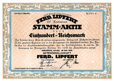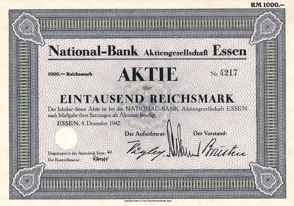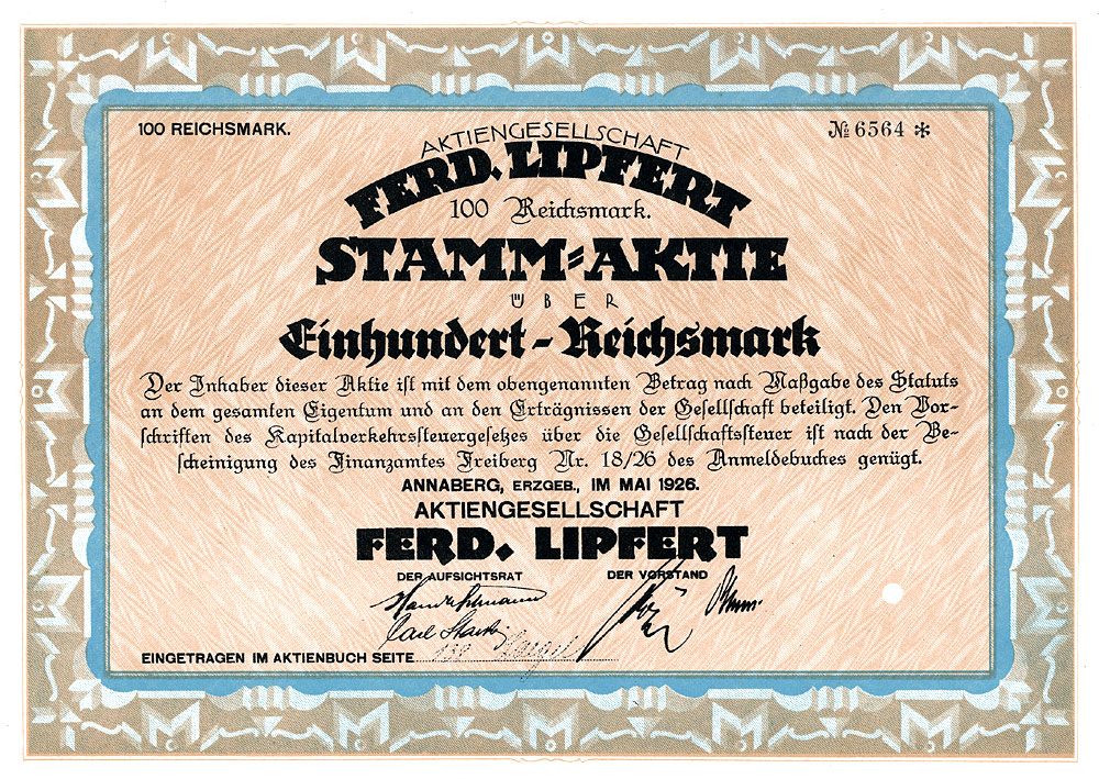 Firmenname Ort Art Nennwert Datum AG Ferd. Lipfert Annaberg, Erzgeb. Aktie 100 RM Mai 1926 AMYLO Deutsche Getreideimport Bank AG Münster i. W. Aktie 100 RM Febr. 1925 Bank für Brau-Industrie Berlin Aktie 100 RM März 1933 Bank für Mittelsachsen AG Mittweida Aktie 100 RM 15. Apr 1929 Bankverein Artern, Spröngerts, Büchner & Co. KG auf Aktien Artern Aktie 100 RM S31. Mai 1925 Bankverein Artern, Spröngerts, Büchner & Co. KG auf Aktien Artern Aktie 1.000 RM 31. Mai 1925 Bankverein Artern, Spröngerts, Büchner & Co. KG auf Aktien Artern Aktie 20 RM 30. Apr 1927 Bankverein Artern, Spröngerts, Büchner & Co. KG auf Aktien Artern Aktie 100 RM 30. Apr 1927 ![]() Braunschweig-Hannoversche Hypothekenbank Braunschweig Aktie 1.200 Mark 2. Jan 1911 Braunschweig-Hannoversche Hypothekenbank Braunschweig Aktie 1.200 Mark Juni 1923 Braunschweig-Hannoversche Hypothekenbank Braunschweig Aktie 100 RM Juni 1927 Commerz- und Privat-Bank AG Hamburg Aktie 100 RM 2. Apr 1932 Deutsche Hypothekenbank Meiningen Aktie 100 RM 12. Nov 1930 Deutsche Wohnstätten-Hypothekenbank AG Berlin Aktie 10 x 1.000 RM März 1927 Dresdner Immobilien-Verkehrsbank AG Dresden Aktie 1.000 Mark 1. Apr 1913 Dürener Bank Düren Aktie 100 RM Fre, 19. Jun 1925 Dürener Bank Düren Aktie 100 RM Fre, 27. Mai 1927 Dürener Bank Düren Aktie 1.000 RM Okt. 1938 Landesbank Westsachsen AG Plauen i.V. Aktie 100 RM Aug. 1927 Leipziger Immobiliengesellschaft - Bank für Grundbesitz AG Leipzig Aktie 1.000 RM 10. Mai 1927 Leipziger Immobiliengesellschaft - Bank für Grundbesitz AG Leipzig Aktie 1.000 RM 2. Sep 1928 National-Bank AG Essen Aktie 1.000 RM Dez. 1938 National-Bank AG Essen Aktie 1.000 RM 4. Dez 1942 Oldenburgische Landesbank (Spar- und Leihbank) AG Oldenburg i.O. Aktie 100 RM Febr. 1935 Plauener Bank AG Plauen i.V. Aktie 100 RM 12. Apr 1927 Pommersche Bank AG Stettin Aktie 100 RM April 1933 Pommersche Bank AG Stettin Aktie 1.000 RM April 1933 |