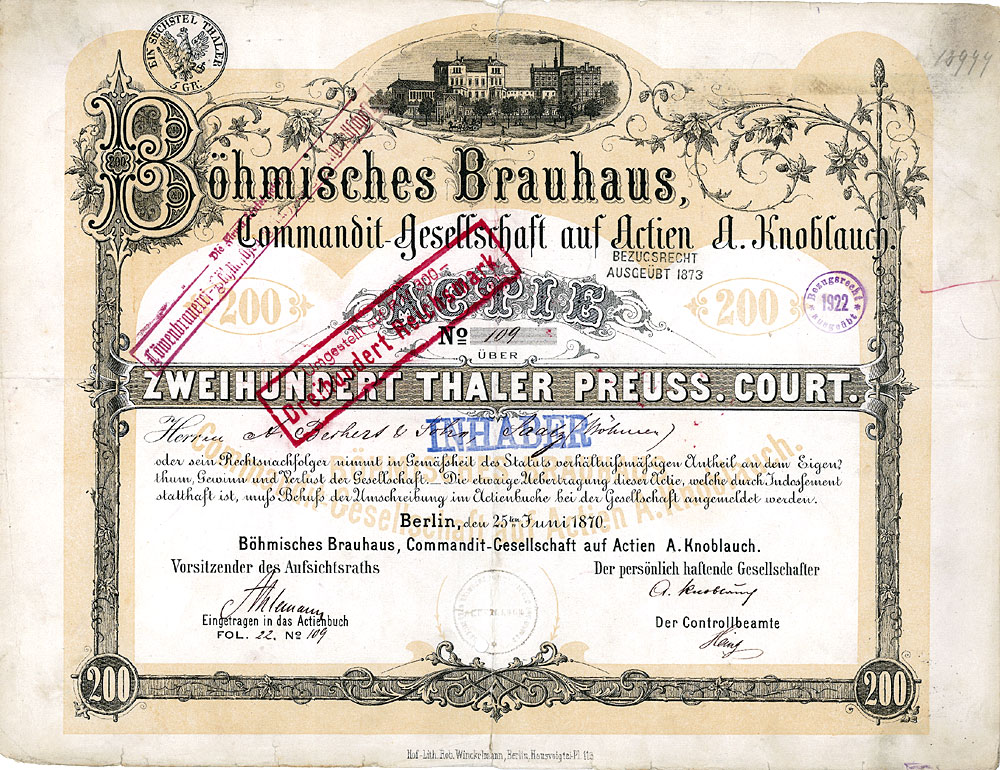 Firmenname Ort Art Nennwert Datum AG für Industrie-Unternehmungen am Friedrichshain Berlin Aktie 100 RM April 1930 Aktienbrauerei zum Hasen Augsburg Aktie 100 RM 14. Mär 1935 Bank für Brau-Industrie Berlin Aktie 100 RM März 1933 Bayerische Aktien-Bierbrauerei Aschaffenburg Aktie 100 RM 31. Dez 1933 Bierbrauerei Gebr. Müser AG Bochum-Langendreer Aktie 100 RM Mai 1936 Bitterfelder Actien-Bierbrauerei vormals A. Brömme Bitterfeld Aktie 1.000 Mark 10. Dez 1921 Böhmisches Brauhaus Commandit-Gesellschaft auf Actien A. Knoblauch Berlin Namens-Actie 200 Thaler 25.6.1870 Breslauer Actien-Malz-Fabrik Breslau Aktie 1.000 Mark Okt. 1890 Breslauer Actien-Malzfabrik Breslau Aktie 1.000 RM Juni 1926 C. Kipke Brauerei AG Breslau Aktie 300 RM Febr. 1939 Dortmunder Actien-Brauerei Dortmund Aktie 1.000 RM Jan. 1942 Dortmunder Ritterbrauerei AG Dortmund Aktie 1.000 Mark 20. März 1918 Dortmunder Ritterbrauerei AG Dortmund Aktie 1.000 Mark 5. Juni 1918 Dortmunder Ritterbrauerei AG Dortmund Aktie 1.000 Mark 16. Juni 1920 Dortmunder Ritterbrauerei AG Dortmund Aktie 1.000 Mark 13. Januar 1921 Dortmunder Ritterbrauerei AG Dortmund Aktie 1.000 Mark 20. September 1921 Dortmunder Ritterbrauerei AG Dortmund Aktie 1.000 Mark 8. Februar 1923 Dortmunder Ritterbrauerei AG Dortmund Aktie 6 x 1.000 Mark 8. Februar 1923 Dortmunder Ritterbrauerei AG Dortmund Aktie 1.000 Mark 19. Januar 1924 Dortmunder Ritterbrauerei AG Dortmund Aktie 1.000 RM 11. Februar 1927 Dortmunder Ritterbrauerei AG Dortmund Aktie 200 RM 9. Februar 1929 Dortmunder Ritterbrauerei AG Dortmund VZ-Aktie Lit. B 200 RM März 1939 Dortmunder Ritterbrauerei AG Dortmund Aktie 100 RM Juli 1942 Dortmunder Ritterbrauerei AG Dortmund Aktie 1.000 RM Juli 1942 Dortmunder Union-Brauerei AG Dortmund Aktie 1.000 RM 4. Nov 1941 Schlegel-Scharpenseel-Brauerei AG Bochum Aktie 200 RM Jan. 1938 Schlegel-Scharpenseel-Brauerei AG Bochum Aktie 1.000 RM Jan. 1938 Schloß-Brauerei Chemnitz AG Chemnitz Aktie 100 RM 23. März 1939 Schloß-Brauerei Chemnitz AG Chemnitz Aktie 1.000 RM 23. März 1939 |