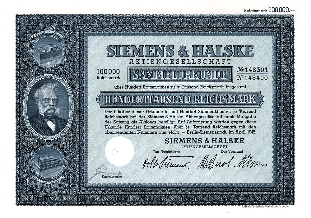 Firmenname Ort Art Nennwert Datum Natronzellstoff- und Papierfabriken AG Berlin Aktie 1.000 RM Okt. 1942 Niederbarnimer Eisenbahn-AG Berlin-Wilhelmsruh Aktie 100 RM Okt. 1940 Norddeutsche Kabelwerke AG Berlin-Neukölln Aktie 1.000 RM April 1928 Norddeutsche Lederwerke AG Berlin Aktie 1.000 RM März 1941 Persische Teppich-Gesellschaft AG Berlin Aktie 100 RM 8. Mai 1926 Poppe & Wirth AG Berlin Aktie 100 RM April 1928 Preßluftwerkzeug- und Maschinenbau AG "PREMAG" Berlin Aktie 100 RM 6. Sep 1932 Scheidemandel-Motard-Werke AG Berlin Aktie 100 RM April 1941 Scheidemandel-Motard-Werke AG Berlin Aktie 1.000 RM Juli 1941 Scheidemandel-Motard-Werke AG Berlin Aktie 1.000 RM Juli 1942 Spinnstofffabrik Zehlendorf AG Berlin-Zehlendorf Aktie 1.000 RM Sept. 1941 Spratt's AG Berlin Aktie 1.000 Mark 9. Aug 1917 Steffens & Nölle AG Berlin Aktie 1.000 Mark April 1907 Terraingesellschaft "Frankfurter Chaussee" AG Berlin Aktie 100 RM Dez. 1928 Vereinigte Berliner Mörtelwerke Berlin Aktie 1.000 Mark Juni 1922 Vereinigte Berliner Mörtelwerke Berlin Aktie 1.000 Mark 20. Jun 1923 Ravené Stahl AG Berlin Aktie Lit. B 1.000 RM 26. Apr 1929 Ravené Stahl AG Berlin Aktie 1.000 RM 26. Apr 1929 Rixdorf-Mittenwalder Eisenbahn-Gesellschaft Berlin Aktie Lit. A 1.000 Mark Fre, 1. Okt 1909 Siemens & Halske AG Berlin Sammelaktie 100 x 1.000 RM April 1942 Siemens & Halske AG Berlin Sammel-VZ-Aktie 100 x 1.000 RM April 1942 Stadt Berlin Berlin 7 % Gold-SV 500 RM 26. Okt 1926 Stadt Berlin Berlin 7 % Gold-SV 1.000 RM 26. Okt 1926 |