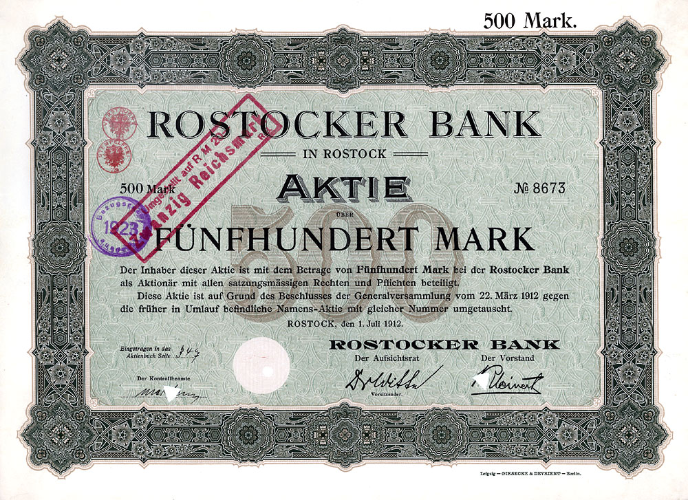 Firmenname Ort Art Nennwert Datum Freistaat Mecklenburg-Schwerin Schwerin 8 % SV 100 RM 1. März 1928 Freistaat Mecklenburg-Schwerin Schwerin i.M. 8 % SV 200 RM 28. Jan 1929 Freistaat Mecklenburg-Schwerin Schwerin i.M. 8 % SV 500 RM 28. Jan 1929 Freistaat Mecklenburg-Strelitz Neustrelitz 7,5 % SV 100 RM 31. März 1930 Freistaat Mecklenburg-Strelitz Neustrelitz 7,5 % SV 500 RM 31. März 1930 Freistaat Mecklenburg-Strelitz Neustrelitz 7,5 % SV 1.000 RM 31. März 1930 Land Mecklenburg Schwerin i.M. 4 % SV 100 RM 1. April 1942 Land Mecklenburg Schwerin i.M. 4 % SV 500 RM 1. April 1942 Land Mecklenburg Schwerin i.M. 4 % SV 1.000 RM 1. April 1942 Land Mecklenburg Schwerin i.M. 4 % SV 2.000 RM 1. April 1942 Mecklenburgische Friedrich Wilhelm Eisenbahn-Gesellschaft Wesenberg Aktie Lit. B 1.000 Mark 1. Apr 1902 Mecklenburgische Friedrich Wilhelm Eisenbahn-Gesellschaft Wesenberg Prior.-St.-Aktie 1.000 Mark 1. April 1902 Mecklenburgische Friedrich Wilhelm Eisenbahn-Gesellschaft Neustrelitz Prior.-St.-Actie 1.000 Mark 1. April 1907 Mecklenburgische Friedrich Wilhelm Eisenbahn-Gesellschaft Neustrelitz Aktie Lit. A 1.000 Mark 1. April 1910 Mecklenburgische Friedrich Wilhelm Eisenbahn-Gesellschaft Neustrelitz Aktie Lit. B 1.000 Mark 1. April 1910 Mecklenburgische Friedrich Wilhelm Eisenbahn-Gesellschaft Wesenberg Aktie Lit. A 1.000 Mark 1. April 1922 Mecklenburgische Friedrich Wilhelm Eisenbahn-Gesellschaft Wesenberg Aktie Lit. A 1.000 Mark 15. Nov 1923 Mecklenburgische Friedrich Wilhelm Eisenbahn-Gesellschaft Neustrelitz Aktie Lit. A 5.000 Mark 15. Nov 1923 Mecklenburgischer Ritterschaftlicher Kreditverein Seestadt Rostock 4,5 % Pfandbrief 500 RM 1. Juni 1940 Mecklenburgischer Ritterschaftlicher Kreditverein Seestadt Rostock 4,5 % Pfandbrief 1.000 RM 1. Juni 1940 Mecklenburgischer Ritterschaftlicher Kreditverein Seestadt Rostock 4,5 % Pfandbrief 2.000 RM 1. Juni 1940 Pommersche Eisengießerei und Maschinenfabrik AG Stralsund Aktie 5.000 Mark Aug. 1923 Pommersche Eisengießerei und Maschinenfabrik AG Stralsund Aktie 100 RM April 1929 Pommersche Eisengießerei und Maschinenfabrik AG Stralsund Aktie 1.000 RM April 1929 Pommersche Eisengießerei und Maschinenfabrik AG Stralsund Aktie 100 RM Nov. 1941 Rostocker Bank Rostock Aktie 500 Mark 1. Jul 1912 Rostocker Bank Rostock Aktie 200 RM März 1928 |