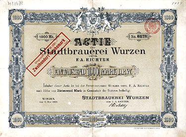 Firmenname Ort Art Nennwert Datum Chemische Fabrik von Heyden AG Radebeul Aktie 1.000 RM 1. Mär 1929 Chemische Fabrik von Heyden AG Radebeul Aktie 1.000 RM 30. Jun 1942 Deutsche Werkstätten AG Rähnitz-Hellerau Aktie 100 RM 20. Jul 1931 Deutsche Werkstätten AG Rähnitz-Hellerau Aktie 100 RM Fre, 29. Dez 1933 Dresdner Chromo- & Kunstdruck-Papierfabrik Krause & Baumann AG Heidenau Aktie 1.000 Mark Juli 1923 Elbtalwerk Elektrizitäts-AG Heidenau Aktie 100 RM Aug. 1927 Elbtalwerk Elektrizitäts-AG Heidenau Aktie 1.000 RM Dez. 1941 Färberei Glauchau AG Glauchau Aktie 100 RM 25. Mai 1932 Gebler-Werke AG Radebeul Aktie 300 RM Aug. 1929 Gechter & Kühne AG Heidenau Aktie 1.000 Mark 16. Dez 1921 Gechter & Kühne AG Heidenau Aktie 10.000 Mark 8. Feb 1923 Großenhainer Webstuhl- und Maschinen-Fabrik AG Großenhain Aktie 1.000 RM März 1928 Heidenauer Papierfabrik AG Heidenau Aktie 100 RM April 1938 Heinrich Dietel AG Wilkau Aktie 1.000 RM 2. Jan 1928 Hotel-AG Glauchau Glauchau Aktie 200 RM 10. Dez 1925 Kohlen-Bahn-AG Reichenau i.Sa. Aktie 1.000 Mark 10. Jan 1922 Kötitzer Ledertuch- und Wachstuch-Werke AG Coswig Aktie 100 RM Juli 1942 Kötitzer Ledertuch- und Wachstuch-Werke AG Coswig Aktie 1.000 RM Juli 1942 Mitteldeutsche Kunstanstalt AG Heidenau Aktie 1.000 Mark Nov. 1923 Planeta Druckmaschinenwerk AG Radebeul Aktie 100 RM Aug. 1942 Radeberger Bank AG Radeberg Aktie 100 Goldmark 15. Jul 1924 Sächsische Gußstahl-Werke Döhlen AG Freital Aktie 100 RM März 1931 Stadtbrauerei Wurzen vorm. F. A. Richter Wurzen Actie 1.000 Mark 11.5.1888 Steingutfabrik Colditz AG Colditz i.Sa. Aktie 1.000 Mark 24. Apr 1923 Thode'sche Papierfabrik AG Hainsberg Aktie 100 RM 11. Apr 1925 W. Hirsch AG für Tafelglasfabrikation Radeberg Aktie 1.000 Mark 27. Apr 1923 W. Hirsch AG für Tafelglasfabrikation Radeberg Aktie 1.000 Mark 8. Nov 1923 Wurzener Bank Wurzen Aktie 100 RM 14. Jul 1924 Wurzener Bank Wurzen Aktie 100 RM 14. Mär 1927 Wurzener Kunstmühlenwerke und Biscuitfabriken vorm. F. Krietsch Wurzen i/Sa. Aktie 100 RM 10. Apr 1931 Wurzener Kunstmühlenwerke und Biscuitfabriken vorm. F. Krietsch Wurzen i/Sa. VZ-Aktie 100 RM 10. Apr 1931 |