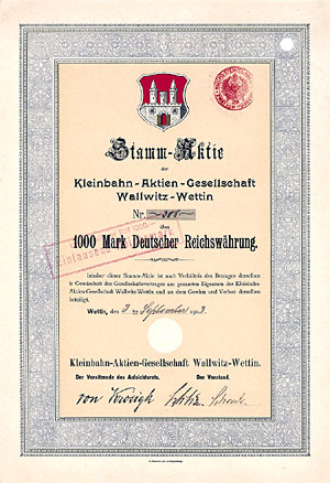 Firmenname Ort Art Nennwert Datum Deutsche Post- und Eisenbahn-Verkehrswesen AG (Dapag-Efubag) Staaken Aktie 100 RM 24. Juni 1933 Electricitäts-Werke Liegnitz Liegnitz Aktie 1.000 Mark 16.1.1898 Electricitäts-Werke Liegnitz Liegnitz Aktie 1.000 Mark 12. November 1921 Electricitäts-Werke Liegnitz Liegnitz Aktie 300 RM 7. April 1926 Electricitäts-Werke Liegnitz Liegnitz Aktie 300 RM 19. November 1927 Kleinbahn Horka-Rothenburg-Priebus AG Rothenburg O/L. Aktie 100 RM 13. Jun 1929 Kleinbahn-AG Wallwitz-Wettin Wettin Aktie 1.000 Mark 3. September 1903 Kohlen-Bahn-AG Reichenau i.Sa. Aktie 1.000 Mark 10. Januar 1922 Leipziger Aussenbahn AG Leipzig Aktie 1.000 Mark 1. Juni 1900 Leipziger Aussenbahn AG Leipzig Aktie 1.000 Mark 5. Juni 1909 Leipziger Aussenbahn AG Leipzig Aktie 1.000 Mark 17. März 1914 Mecklenburgische Friedrich Wilhelm Eisenbahn-Gesellschaft Wesenberg Aktie Lit. B 1.000 Mark 1. April 1902 Mecklenburgische Friedrich Wilhelm Eisenbahn-Gesellschaft Wesenberg Prior.-St.-Aktie 1.000 Mark 1. April 1902 Mecklenburgische Friedrich Wilhelm Eisenbahn-Gesellschaft Neustrelitz Prior.-St.-Actie 1.000 Mark 1. April 1907 Mecklenburgische Friedrich Wilhelm Eisenbahn-Gesellschaft Neustrelitz Aktie Lit. A 1.000 Mark 1. April 1910 Mecklenburgische Friedrich Wilhelm Eisenbahn-Gesellschaft Neustrelitz Aktie Lit. B 1.000 Mark 1. April 1910 Mecklenburgische Friedrich Wilhelm Eisenbahn-Gesellschaft Wesenberg Aktie Lit. A 1.000 Mark 1. April 1922 Mecklenburgische Friedrich Wilhelm Eisenbahn-Gesellschaft Wesenberg Aktie Lit. A 1.000 Mark 15. November 1923 Mecklenburgische Friedrich Wilhelm Eisenbahn-Gesellschaft Neustrelitz Aktie Lit. A 5.000 Mark 15. November 1923 Ostpreussische Kleinbahnen-AG Königsberg i.Pr. Aktie Lit. B 700 RM Mit, 1. April 1925 Paderborner Elektrizitätswerk und Straßenbahn-AG Paderborn Aktie 600 RM Mai 1930 Prignitzer Eisenbahn-Gesellschaft Perleberg Prior.-Stamm-Actie 300 Mark 1.3.1885 Prignitzer Eisenbahn-Gesellschaft Perleberg Stamm-Actie 300 Mark 1.3.1885 |