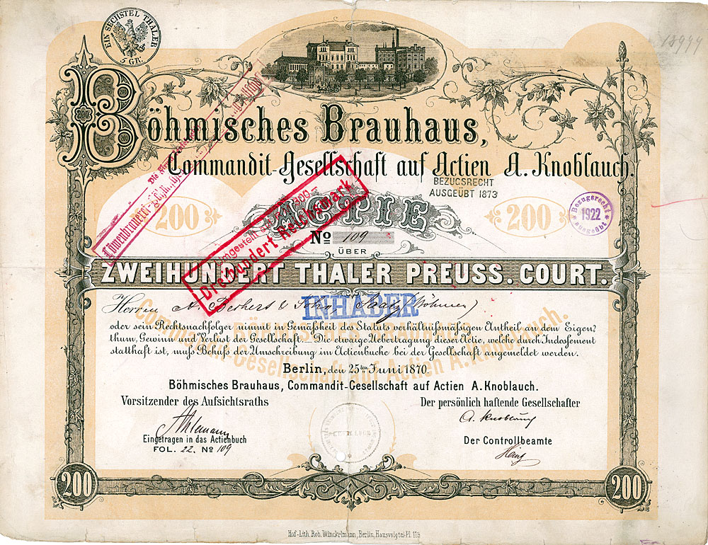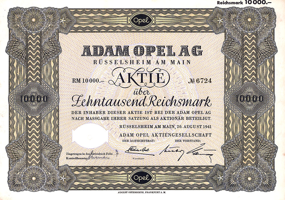 | Nr. 44 Schätzpreis: 70,00 EUR Startpreis: 35,00 EUR A.H.I-Bau Allgemeine Hoch- und Ingenieurbau-AG Aktie 1.000 DM, Nr. 4003 Düsseldorf, Mai 1962 EF+ Auflage: 3100. Gründung 1904 als “Allgemeine Hochbau-GmbH”, seit 1921 AG. 1933 Umbenennung in Allgemeine Hoch- und Tiefbau AG, 1935 in Allgemeine Hoch- und Ingenieurbau-AG, ab 1953 A.H.I.-BAU Allgemeine Hoch- und Ingenieurbau-AG. Am Ausbau der Häfen von Montevideo (Uruguay) und Rotterdam hatte die AHI schon vor Beginn des 1. Weltkrieges großen Anteil. Niederlassungen bestanden in Köln, Hamburg, Halle/Saale und Den Haag, später auch in Berlin, Mannheim und Wien. 1951 wurde eine schwedische Lizenz für ein neuartiges Gleitschnellbauverfahren für Silos, Bunker, Fernsehtürme und Hochhäuser erworben. Niederlassungen gab es wegen der erfolgreichen Entwicklung nun in Berlin, Bochum, Braunschweig, Bremen, Düsseldorf, Frankfurt (Main), Hamburg, Hannover, Köln, Mainz, Mannheim, München, Saarbrücken und Siegen. In Düsseldorf und Berlin börsennotiert. 1969 Abschluss eines Beherrschungsvertrages mit der Strabag Bau-AG, die inzwischen über 90 % der Aktien besaß. (Einlieferer-Nr.: 32) Nr. 45 Schätzpreis: 180,00 EUR Startpreis: 90,00 EUR Aachener Kleinbahn-Gesellschaft Aktie 1.200 Mark, Nr. 4451 Aachen, 5.6.1896 EF Auflage: 3500. Gegr. 1880 als Aachener und Burtscheider Pferdeeisenbahn, Dampfbetrieb ab 1884, elektrischer Betrieb ab 1895. Zeitweise über 200 km Betriebslänge. 1894 Umfirmierung in Aachener Kleinbahn, seit 1942 (die bis heute börsennotierte) Aachener Straßenbahn- und Energieversorgungs-AG. Großaktionäre sind seit langer Zeit Stadt und Landkreis Aachen. Lochentwertet. Überdurchschnittlich guter Erhaltungszustand. (Einlieferer-Nr.: 46) Nr. 46 Schätzpreis: 180,00 EUR Startpreis: 90,00 EUR Aachener Kleinbahn-Gesellschaft Aktie 2.000 Mark, Nr. 6933 Aachen, 1.10.1912 EF+ Auflage: 500. Lochentwertet. (Einlieferer-Nr.: 24) Nr. 47 Schätzpreis: 1.200,00 EUR Startpreis: 680,00 EUR Actien-Gesellschaft für Gasbeleuchtung zu Fürth Actie 200 Gulden, Nr. 211 Fürth, 1.10.1858 EF Gründeraktie, Auflage: 925. Die Stadt Fürth erteilte L. A. Riedinger auf 33 Jahre die Konzession zum Bau einer Gasfabrik. In diesen Vertrag über Einführung der Gasbeleuchtung in Fürth trat die neugegründete Actien-Gesellschaft auf den Zeitpunkt der vollständigen Inbetriebsetzung der Gasfabrik ein. Die Stadt Fürth selbst beteiligte sich mit 600 Aktien, hielt also die Mehrheit. Zur Geschichte der Gasbeleuchtung: Schon 1727 und 1739 bemerkten Hales und Clayton, daß man aus Steinkohlen ein leuchtendes Gas gewinnen könne. Doch bis zur technischen Vervollkommnung der Gasbeleuchtung war es zunächst ein langer Weg. 1810 wurde in London die erste Gasgesellschaft vom Parlament bestätigt, 1814 ließ zuerst das Kirchspiel St. Margareths in London seine Öllampen durch Gaslaternen ersetzen. In Deutschland wurde die Gasbeleuchtung zuerst 1816 im königl. Amalgamierwerk bei Freiberg eingerichtet. Die Gasindustrie als solche aber kam wiederum 1826 zuerst von England zu uns, indem Hannover und Berlin durch die Imperial Continental Gas Association mit aus Steinkohle gewonnenem Leuchtgas versorgt wurden. Danach entstanden in rascher Folge in allen deutschen Städten von einiger Bedeutung eigene Gasanstalten zur Fabrikation des Leuchtgases. Ganz außergewöhnlich dekorative Gestaltung durch das Xylographische Atelier Leo Bock in München, Holzschnitt-Abb. mit Ansichten von Gaswerk, Öfen und Gasometern sowie Darstellung der Vorzüge der Gasbeleuchtung im Comptoir und in den Straßen der Stadt. Doppelblatt + Kupons. Rechte obere Ecke nur leicht verfärbt, insgesamt ein tadelloses Stück. (Einlieferer-Nr.: 34) Nr. 48 Schätzpreis: 400,00 EUR Startpreis: 200,00 EUR Actien-Zucker-Fabrik Peine Actie 100 Thaler, Nr. 901 Peine, 17.1.1866 VF Gründeraktie. Die Zuckerfabrik wurde 1866 von der Braunschweigischen Maschinenbauanstalt errichtet. 1969 auf die Lehrter Zucker AG verschmolzen. Inwendig Übertragungsvermerke bis 1950. Äußerst dekorativ, große Abb. der Zuckerfabrik. Doppelblatt. Entwertet durch Abschnitt der rechten unteren Ecke. Mehrere kleine Knickfalteneinrisse hinterklebt. Weniger als 10 Stücke sind bekannt. (Einlieferer-Nr.: 14) Nr. 49 Schätzpreis: 250,00 EUR Startpreis: 125,00 EUR Actien-Zucker-Fabrik Stendal Actie 1.250 Mark, Nr. 801 Stendal, 15.6.1892 VF Gründeremission, Auflage: 850. Aktionär durfte nur werden, der die Landwirtschaft als Eigentümer oder Pächter betrieb und nicht Mitglied einer anderen Zuckerfabrik war. Originalunterschriften u.a. vom Vorsitzenden des Aufsichtsrats von Bismarck vorderseitig und bei den Übertragungsvermerken auf der Rückseite. (Einlieferer-Nr.: 35) Nr. 50 Schätzpreis: 150,00 EUR Startpreis: 75,00 EUR Actien-Zuckerfabrik Bockenem Namens-Actie 1.200 Mark = 400 Taler, Nr. 97 1.7.1875 VF Gründung 1874. 1930 brannte die Fabrik vollständig nieder, 1931 Neuaufbau durch die Braunschweigische Maschinenbauanstalt. Originalunterschriften. Doppelblatt. Entwertet durch Abschnitt der rechten unteren Ecke. Inwendig Übertragungsvorgang von 1943. Sehr selten. (Einlieferer-Nr.: 14) ![]() Nr. 51 Schätzpreis: 800,00 EUR Startpreis: 380,00 EUR Adam Opel AG Aktie 10.000 RM, Nr. 7220 Rüsselsheim, 20.8.1941 VF Auflage: 2000. Adam Opel (1837-1895) gründete nach seinen Lehr- und Wanderjahren 1862 in Rüsselsheim eine Nähmaschinenfabrik. 1887 Beginn der Fahrradproduktion - 40 Jahre später ist Opel eine der größten Fahrradfabriken der Welt (Opel produzierte über 2,5 Mio. Fahräder, 1937 wird die Fahrradproduktion eingestellt). 1899 wird in Rüsselsheim das erste Auto hergestellt, ein Opel Patent-Motorwagen System Lutzmann mit 4 PS. 1911 wird die Fabrik durch einen Großbrand fast völlig zerstört; nach Herstellung von 1 Mio. Einheiten wird danach die Nähmaschinenproduktion nicht wieder aufgenommen. 1924 Beginn der Großserienproduktion von Automobilen und Einführung von Fließbändern. 1928 Umwandlung der Adam Opel KG in 