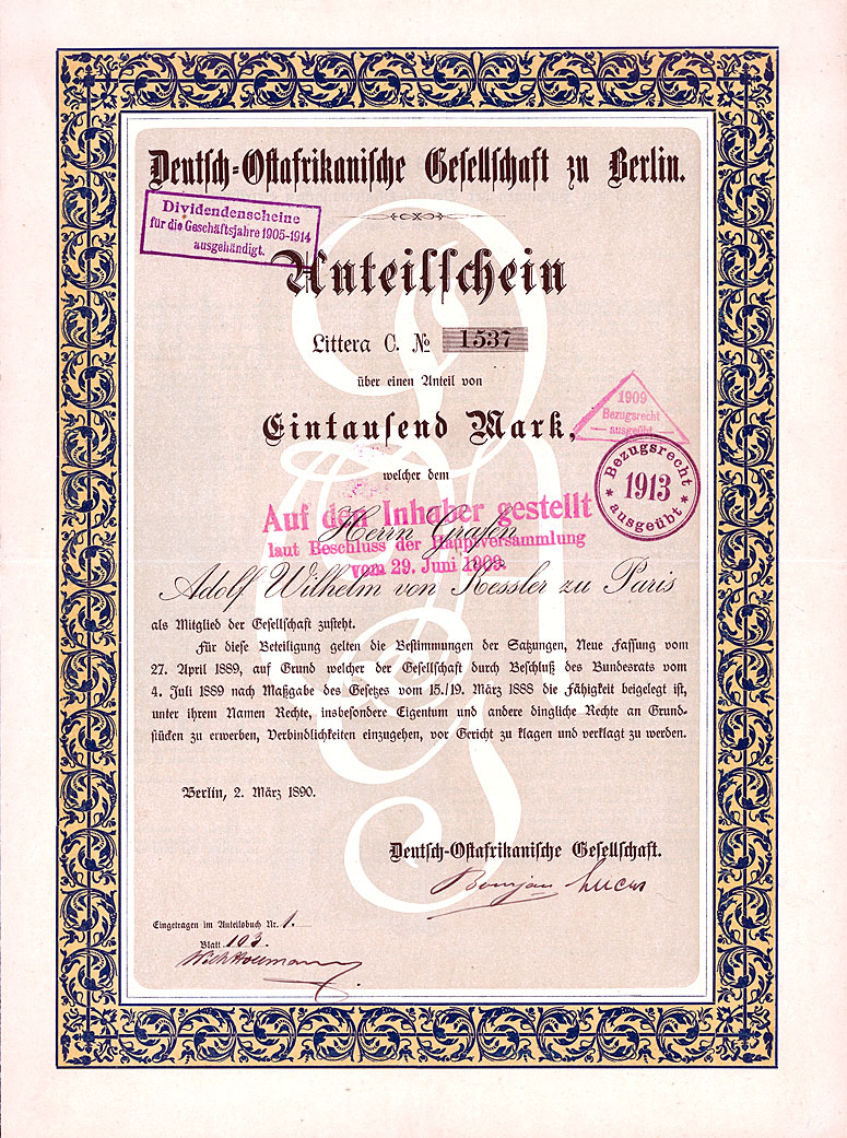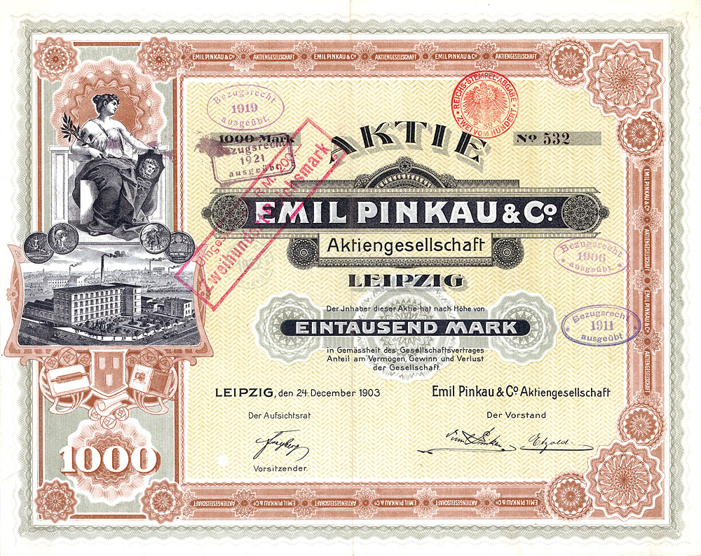 | Nr. 130 Schätzpreis: 250,00 EUR Startpreis: 125,00 EUR Daimler-Benz AG Aktie 600 RM, Nr. 18947 Berlin, Aug. 1934 EF Gottlieb Daimler errichtete 1882 eine kleine Versuchswerkstatt in Cannstadt, erhielt 1883 das Patent für den ersten schnelllaufenden Verbrennungsmotor und gründete 1890 die „Daimler-Motoren-Gesellschaft“. Carl Benz gründete 1883 in Mannheim die „Benz & Cie. Rheinische Gasmotorenfabrik“. Trotz der räumlichen Nähe sind sich die beiden Auto-Pioniere zeitlebens nie persönlich begegnet. Ihre Firmen, die beiden ältesten Automobilfabriken der Welt, wurden 1926 zur Daimler-Benz AG verschmolzen. 1999 Fusion mit der Nr. 3 am US-Automobilmarkt zur DaimlerChrysler AG. Mit Mercedes-Stern in der Umrandung. Ohne Lochentwertung. (Einlieferer-Nr.: 27) Nr. 131 Schätzpreis: 50,00 EUR Startpreis: 25,00 EUR Daimler-Benz AG Aktie 1.000 RM, Nr. 103745 Stuttgart, Dez. 1941 EF+ G & D-Druck. Mit Mercedes-Stern im Unterdruck. Prägesiegel lochentwertet. (Einlieferer-Nr.: 46) Nr. 132 Schätzpreis: 150,00 EUR Startpreis: 75,00 EUR Daimler-Benz AG Aktie 100 DM, Nr. 48699 Stuttgart, Nov. 1952 EF/VF Toller Stahlstich von G&D mit Brustporträts von Gottlieb Daimler und Carl Benz. Prägesiegel lochentwertet. (Einlieferer-Nr.: 34) Nr. 133 Schätzpreis: 120,00 EUR Startpreis: 60,00 EUR Daimler-Benz AG Aktie 5 DM, Nr. 42096 Stuttgart, Juni 1996 EF+ Toller Stahlstich von G&D mit Brustporträts von Gottlieb Daimler und Carl Benz. Prägesiegel lochentwertet. (Einlieferer-Nr.: 31) Nr. 134 Schätzpreis: 200,00 EUR Startpreis: 100,00 EUR Dampfschifffahrts-Gesellschaft für den Nieder- und Mittel-Rhein (Wahlbezirk Coblenz) Aktie 1.000 Mark, Nr. 4733 Düsseldorf, Jan. 1922 EF/VF Auflage: 3250 (für alle 5 Wahlbezirke zusammen). Personen- und Güterverkehr auf dem Rhein. Bis zur Jahrhundertwende wuchs die Flotte auf 16 Dampfer nebst Kohlenschiffen. Seit 1853 Betriebsgemeinschaft mit dem vormaligen Konkurrenz-Unternehmen „Preussisch-Rheinische Dampfschifffahrt“ in Köln. 1967 fusionierten beide Firmen zur noch heute börsennotierten Köln-Düsseldorfer Deutsche Rheinschiffahrt AG. Eine Besonderheit dieser Gesellschaft war, dass die Aktien auf fünf verschiedene Wahlbezirke verteilt ausgegeben waren. Jede Gruppe wählte separat ihr Aufsichtsratsmitglied. Raddampfer mit Burgenlandschaft im Unterdruck. Faksimile-Unterschrift des Sektfabrikanten Henckell. (Einlieferer-Nr.: 50) Nr. 135 Schätzpreis: 100,00 EUR Startpreis: 50,00 EUR Danziger Privat-Actien-Bank Aktie 100 Danziger Gulden, Nr. 6301 Danzig-Langfuhr, Jan. 1934 UNC Auflage: 2000. Die Ausstattung mit dem Notenbankprivileg bei der Gründung 1856 unterstreicht die Bedeutung dieser Bank. Nach Errichtung der Reichsbank verzichtete die Bank, wie alle anderen deutschen Privatnotenbanken im Laufe der Zeit auch, 1890 auf das die geschäftliche Expansion inzwischen zu sehr behindernde Notenprivileg. Eine starke Expansion folgte zwischen 1900 und 1911 mit der Errichtung von Niederlassungen in Stolp, Graudenz, Köslin, Belgard, Rügenwalde (Pomm.), Marienburg (Opr.) , Lauenburg, Zoppot, Langfuhr, Pr. Stargard, Elbing und Neufahrwasser. 1910 Übernahme des Bankhauses Goldschmidt & Kuttner in Posen und Umwandlung in eine eigene Filiale. 1939/40 Eröffnung weiterer Filialen in Bromberg, Gotenhafen und Thorn, Umstellung des Kapitals von Danziger Gulden auf Reichsmark und Umfirmierung in “Ostdeutsche Privatbank AG”. Börsennotiz in Berlin und Danzig. Fast das gesamte Kapital wurde 1940 von der Bank der deutschen Arbeit AG, Berlin übernommen (das gewerkschaftsnahe Institut wurde nach dem Krieg die Bank für Gemeinwirtschaft). Diese ließ sich 1942 das Bankgeschäft der Danziger übertragen, die alte Danziger Privat-Actien-Bank wurde ein weiteres Mal umbenannt in “AG für Danziger Realwerte”. Kleine Vignette einer Kogge. Lochentwertet. (Einlieferer-Nr.: 32) Nr. 136 Schätzpreis: 100,00 EUR Startpreis: 50,00 EUR Degussa-Hüls AG 250 Stückaktien o.N., Nr. 3000694 Frankfurt a.M., Juni 1999 EF+ Hervorgegangen aus den Firmen „Friedrich Roessler Söhne“ und „Hector Roessler“ übernahm die 1873 gegründete Degussa zunächst das Edelmetallgeschäft der Firma Ph. Abr. Cohen. Neben der Edelmetallscheidung betrieb sie zunächst Handel, dann auch Produktion von chemischen Produkten, zunächst Cyansalzen, später auch Metall-Farben. An die Henkel & Cie. GmbH wurden die Ausgangsstoffe für das auch damals schon bekannte Persil geliefert. 1931/32 Fusion mit dem „Verein für chemische Industrie AG, Frankfurt a.M.“. Im gleichen Jahr Übernahme der „Hiag Holzverkohlungs-Industrie GmbH“, ein ebenfalls bis heute existierender Produktbereich der Degussa. Mit 27 Werken u. 29 großen Beteiligungen heute eines der größten Spezialchemieunternehmen der Welt. Am 9.2.2001 Verschmelzung der Degussa-Hüls AG mit der SKW Trostberg AG zur “neuen” Degussa AG. Sehr dekorative Aufmachung mit Abb. von Molekülen. Rückseitig als ungültig abgestempelt. (Einlieferer-Nr.: 4) Nr. 137 Schätzpreis: 70,00 EUR Startpreis: 35,00 EUR Demag AG 5,5 % Teilschuldv. 1.000 DM, Nr. 630 Duisburg, Okt. 1964 EF Gründung 1910 als Deutsche Maschinenfabrik AG durch Fusion der Duisburger Maschinenbau AG vorm. Bechem & Keetmann, der Märkischen Maschinenbau-Anstalt Ludig Stuckenholz AG in Wetter (Ruhr) und der Benrather Maschinenfabrik AG (vorm. de Fries & Co. in Düsseldorf). Hergestellt wurden in den Werken Duisburg I-III, Düsseldorf-Benrath und Wetter a.d.Ruhr: Hütten- und Bergwerksanlagen aller Art, Pressen, Kompressoren, Getriebe, Rammhämmer, Krane, Diesellokomotiven sowie Greifer, Stahlkonstruktionen und Brücken. 1926 Neugründung der Demag wegen Zusammenlegung mit den Maschinenfabriken der Vereinigte Stahlwerke AG. Zuletzt als Mannesmann-Demag AG Teil des dann von Vodafone übernommenen Mannesmann-Konzerns gewesen. Teil einer durch die Deutsche Bank platzierten Wandelanleihe von 30 Mio. DM. Doppelblatt. Lochentwertet. Nur dieses eine Stück wurde gefunden. (Einlieferer-Nr.: 4