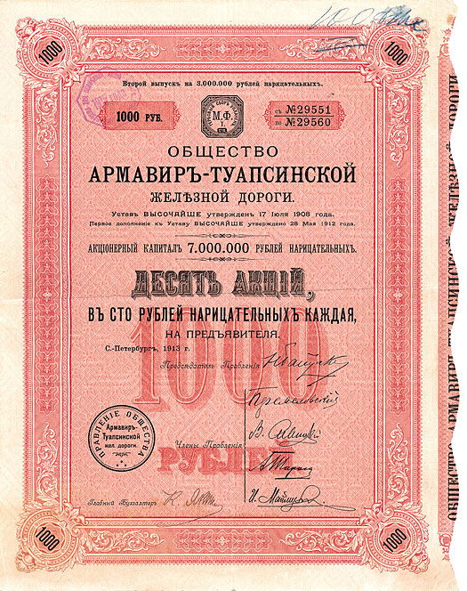 Nr. 1103 Schätzpreis: 600,00 EURStartpreis: 300,00 EUR Armavir-Touapse Eisenbahn-Ges. Aktie 10 x 100 Rbl., Nr. 29551-60 St.-Petersburg, von 1913 VF+ Gegründet 1908 zum Bau der über 200 km langen Bahn von Armawir in Armenien (an der von Rostow am Don zum Kaspischen Meer führenden Hauptmagistrale) nach Tuapse, einem Hafen am Schwarzen Meer. Etwa in der Mitte der Strecke führte ein kleiner Abzweig nach Maikop. Aktie aus der ersten Kapitalerhöhung. Aktientext nur russisch, rückseitig Statuten. Mit anh. restlichen Kupons. Extrem seltene 1.000 Rbl.-Stückelung. (Einlieferer-Nr.: 30) Nr. 1104 Schätzpreis: 80,00 EUR Startpreis: 40,00 EUR Banque Russe du Commerce et de l’Industrie Aktie 250 Rbl., Nr. 116523 St-Petersburg, von 1912 EF/VF Gründung dieser Bank für Handel und Industrie am 1.1.1890. Großaktionäre (1912): u.a. Russisch-Asiatische Bank, British Bank for Foreing Trade, K.W. Nikolajewski, N.W. Rajewski, M.W. Pausner, N.S. Tolmaczew. Die Bank war stark an der Finanzierung der russischen Eisenbahnen beteiligt. 1913 war sie an der Emission von 236.750.000 Rbl. der 5 %-igen chinesischen Anleihe beteiligt. Sehr dekorativ mit Allegorien, Druck in braun/ schwarz. Mit anh. restlichen Kupons. Schwer zu finden! (Einlieferer-Nr.: 69) Nr. 1105 Schätzpreis: 400,00 EUR Startpreis: 200,00 EUR Chinese Government 5 % Reorganisation Gold Loan of 1913 5 % Gold Bond (Certificat Provisoire) 189,40 Rbl., Nr. 15489 St. Petersburg, von 1913 VF+ Zweisprachig russisch/französisch. Mit Stempel der Russisch-Asiatischen Bank. Offensichtlich schon vor über 90 Jahren bei Ausgabe der definitiven Bonds in Vergessenheit geraten! Nicht im Kuhlmann-Katalog verzeichnete Rarität. Nur 4 Stücke wurden vor einigen Jahren in Paris gefunden! (Einlieferer-Nr.: 29) Nr. 1106 Schätzpreis: 60,00 EUR Startpreis: 30,00 EUR Cie. du C.d.F. d’Eisk (Jeisker Eisenbahngesellschaft) 4,5 % Obl. 100 Rbl. = 216 Mark = 128 fl. = 10.11.4 £ = 266 F, Nr. 352 St.-Petersburg, von 1909 EF D/H SU E 1028a, R5. Aufgenommen zum Bau der Strecke Wladikawkas nach Jeisk in Kuban, mit Abzweig zum Hafen. Zweisprachig russisch/ französisch. Mit anh. zwei letzten Kupons. (Einlieferer-Nr.: 68) Nr. 1107 Schätzpreis: 100,00 EUR Startpreis: 50,00 EUR Cie. du C.d.F. d’Eisk (Jeisker Eisenbahngesellschaft) 4,5 % Obl. 1.000 Rbl. = 2.160 Mark = 1.280 fl. = 105.13.4 £ = 2.660 F, Nr. 6025 St.-Petersburg, von 1909 EF D/H SU E 1028c, R7. Aufgenommen zum Bau der Strecke Wladikawkas nach Jeisk in Kuban, mit Abzweig zum Hafen. Zweisprachig russisch/französisch. Mit anh. zwei letzten Kupons. (Einlieferer-Nr.: 68) Nr. 1108 Schätzpreis: 100,00 EUR Startpreis: 50,00 EUR Cie. du C.d.F. d’Eisk (Jeisker Eisenbahngesellschaft) 4,5 % Obl. 500 Rbl. = 1.080 Mark = 640 fl. = 52 £ 16 sh 8 p = 1.330 F, Nr. 3894 St.-Petersburg, von 1909 EF/VF D/H SU E 1028b, R6. Aufgenommen zum Bau der Strecke Wladikawkas nach Jeisk in Kuban, mit Abzweig zum Hafen. Zweisprachig russisch/französisch. Mit anh. zwei Restkupons. (Einlieferer-Nr.: 68) Nr. 1109 Schätzpreis: 20,00 EUR Startpreis: 10,00 EUR Ferghana Eisenbahn 4,5 % Obl. 187,50 Rbl. = 500 F = 19.5.6 £ = 404 Mark = 239 fl., Nr. 224590 Petrograd, von 1914 VF+ D/H SU E 1015, R2. Mit anh. restlichen Kupons. (Einlieferer-Nr.: 68) Nr. 1110 Schätzpreis: 50,00 EUR Startpreis: 25,00 EUR Freiheits-Anleihe der provisorischen Regierung 5 % Obl. 500 Rbl., Nr. 148308 Petrograd, 27.3.1917 VF+ Ein ganzes Kabinett - das erste nach Abdankung des Zaren - hat als provisorische Regierung diesen umgangssprachlich auch als “Friedensanleihe” bezeichneten Titel mit Ministertitel und Namen in Faksimile unterzeichnet. Voran steht der Ministerpräsident und Innenminister Fürst G. E. Lvov, am Ende der Justizminister A. F. Kerenski. Die Anleihe, bekannt auch als die “Kerenski-Anleihe”, begeben nach dem Sturz des Zaren, sollte die Finanzierung der russischen Freiheit sichern. Sehr dekorative graphische Gestaltung mit Abbildung des Taurischen Palastes in St.-Petersburg, das im Jahr 1789 für den berühmten Fürsten G. Potemkin gebaut wurde. Kleinformatig. Mit anh. restlichen Kupons. (Einlieferer-Nr.: 68)