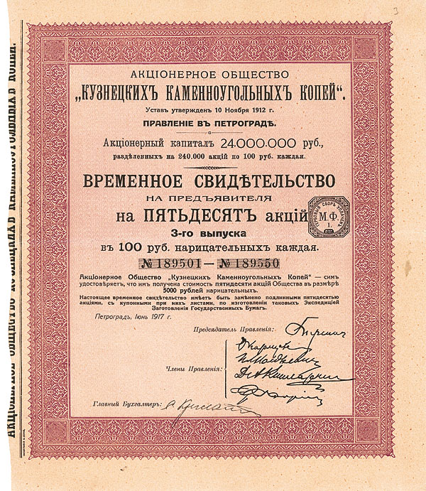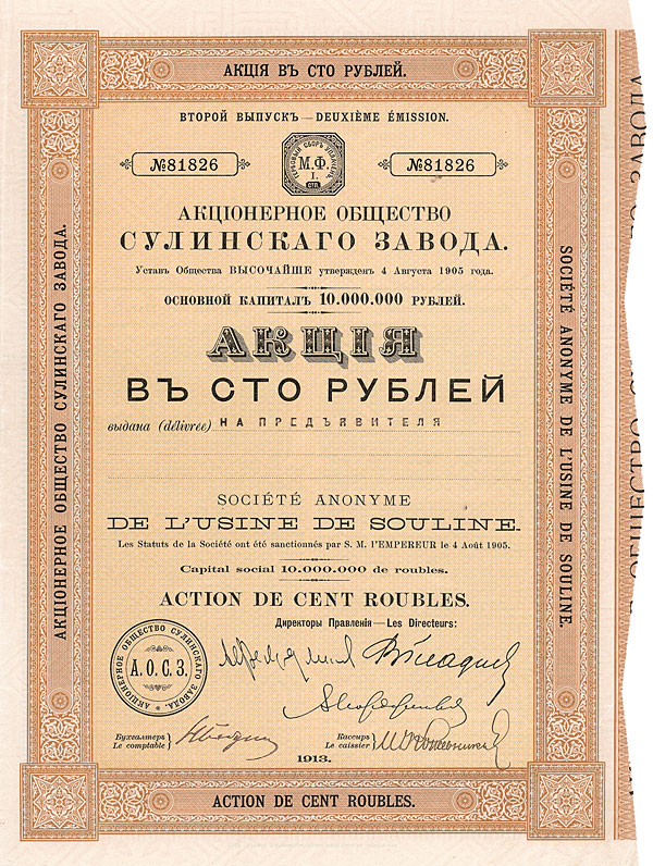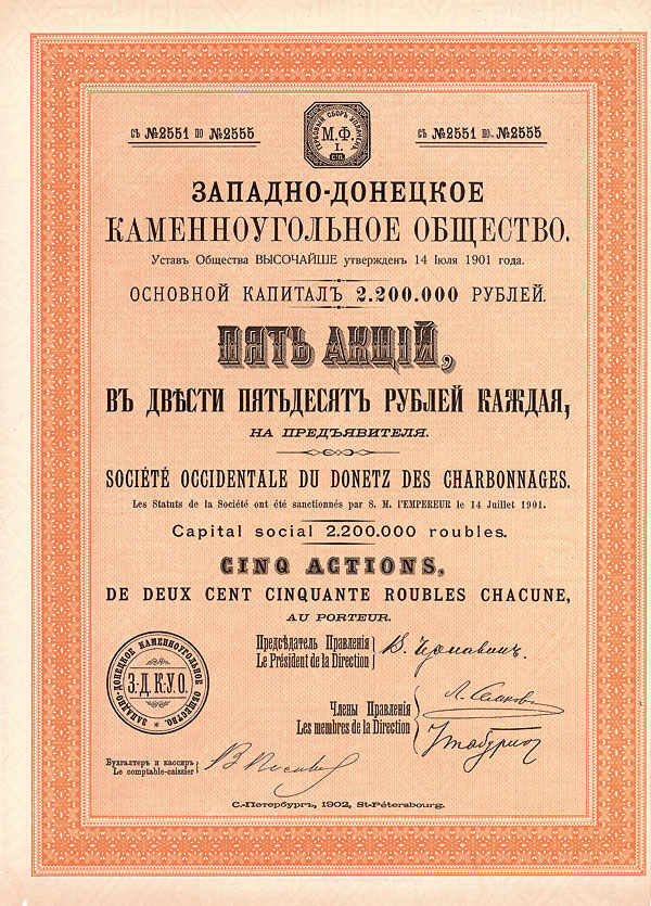 Nr. 1160 Schätzpreis: 150,00 EURStartpreis: 75,00 EUR Soc. Occidentale du Donetz des Charbonnages Action 5 x 250 Rbl., Nr. 2551-2555 St. Petersburg, von 1902 EF Steinkohlenbergwerk im Donetz-Becken, gegründet 1901. Zweisprachig russisch/französisch, rückseitig Statuten. Mit kpl. anh. Kuponbogen. Bisher unbekannt. (Einlieferer-Nr.: 46) Nr. 1161 Schätzpreis: 240,00 EUR Startpreis: 120,00 EUR Soc. Commerciale pour l’Industrie du Naphte “Naphte Transcaucasien” Aktie 100 Rbl., Nr. 9431 St. Petersburg, von 1912 EF/VF Gründeraktie, Auflage: 12.000. Gegründet am 2.7.1911 zwecks Ausbeute der Öllagerstätte im Süden des Kaukasus. Die meisten dortigen Erdölfelder gehörten bereits den Brüdern Nobel, den Rothschilds, Mantachow und Gulbenkian. Zweisprachig russisch/französisch. Mit anh. restlichen Kupons. Äußerst selten. (Einlieferer-Nr.: 82) Nr. 1162 Schätzpreis: 80,00 EUR Startpreis: 40,00 EUR Société de Matériel de Chemins de Fer du Haut-Volga Action 187,50 Rbl., Nr. 3484 St.-Petersburg, von 1903 EF/VF Auflage 8.000. Gegründet wurde die Waggonfabrik im Jahr 1897. Vignette mit Eisenbahnwagen. Zweisprachig russisch/französisch. Mit anh. restlichen Kupons. (Einlieferer-Nr.: 46) Nr. 1163 Schätzpreis: 240,00 EUR Startpreis: 120,00 EUR St.-Petersburger Internationale Handelsbank Aktie 5 x 250 Rbl., Nr. 30116-20 St.-Petersburg, von 1878 VF+ Gegründet 1869 mit deutschem Kapital, kontrolliert durch die Darmstädter Bank (gegr. 1853, 1922 zu Danatbank umorganisiert, 1932 mit der Dresdner Bank verschmolzen). Zu den weiteren deutschen Banken, die ihren Einfluß durch Aktienbeteiligungen sicherten, gehörte die Direction der Disconto-Gesellschaft (gegr. 1856, 1929 mit der Deutschen Bank verschmolzen). Aktientext russisch/deutsch/französisch, Firmenname auch auf griechisch. Rückseitig Statuten russisch/ deutsch. Mit restlichem Kuponbogen. Äußerst selten. (Einlieferer-Nr.: 46)