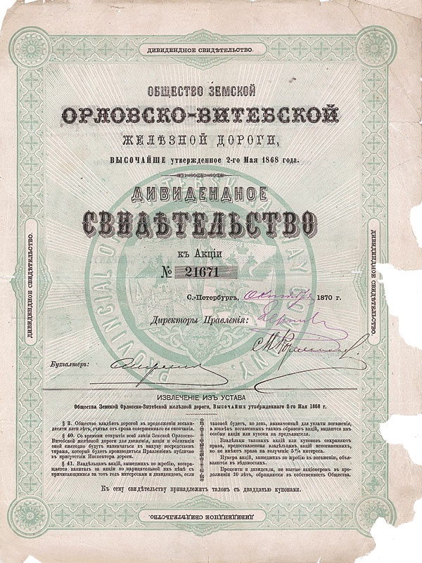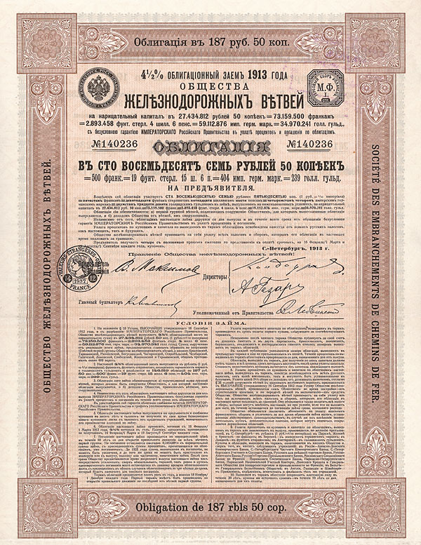Nr. 1184 Schätzpreis: 20,00 EURStartpreis: 10,00 EUR Zufuhrbahn 4,5% Obl. 187,50 Rbl. = 500 F = 19.5.6 £ = 404 Mark = 239 fl., Nr. 140236 St. Petersburg, von 1913 EF/VF D/H SU E 1178, R1. Zweisprachig russisch/französisch. Mit anh. restlichen Kupons. (Einlieferer-Nr.: 68) |