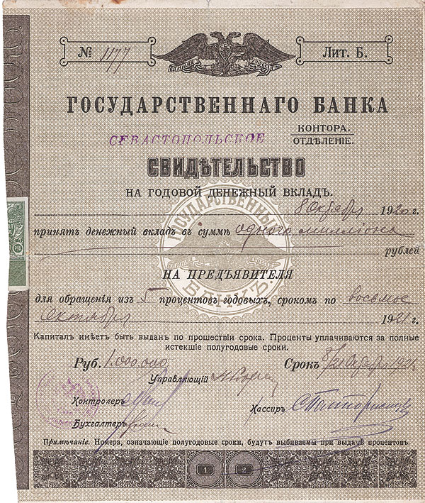 Nr. 1164 Schätzpreis: 300,00 EURStartpreis: 150,00 EUR Staatsbank 5 % Zertifikat 1.000.000 Rbl., Nr. 1177 8.10.1920 VF Kurzfristige Staatsanleihe mit einer Laufzeit von 1 Jahr, ausgegeben in der Zeit des Bürgerkriegs. Vignette mit Doppelkopfadler ohne die Krone mit Umschrift “Jedinaja Rossija” (“Einiges Russland”). Knickfalten, sonst tadellos. Rarität. (Einlieferer-Nr.: 46) Nr. 1165 Schätzpreis: 20,00 EUR Startpreis: 10,00 EUR Stadt Baku 5% Obl. 189 Rbl. = 20 £ = 504 Francs, Nr. 59086 von 1910 VF+ SU T 2005a, R2. Großformatig. Dreisprachig russisch/englisch/französisch. Mit anh. restlichen Kupons. (Einlieferer-Nr.: 68) Nr. 1166 Schätzpreis: 50,00 EUR Startpreis: 25,00 EUR Stadt Jekaterinoslaw 5 % Obl. 200 Rbl. = 533,40 F, Nr. 5769 von 1904 EF/VF Auflage 12500, SU T 2012, R4. Die Stadt wurde 1783 von Fürst G. A. Potemkin gegründet und zu Ehren Katharinas II. Jekaterinoslaw genannt. Seit 1802 war sie Gouvernementshauptstadt der Ukraine und wurde 1917 umbenannt in Dnjepropetrowsk. Anleihe über 2,5 Mio Rbl. für den Wasserleitungsbau, 2 Strecken der elektrischen Straßenbahn, Schlachthof, Lagerhallen, Schulen. Äußerst dekorativ mit 4 Stadtansichten aus Jekaterinoslaw. (Einlieferer-Nr.: 68)