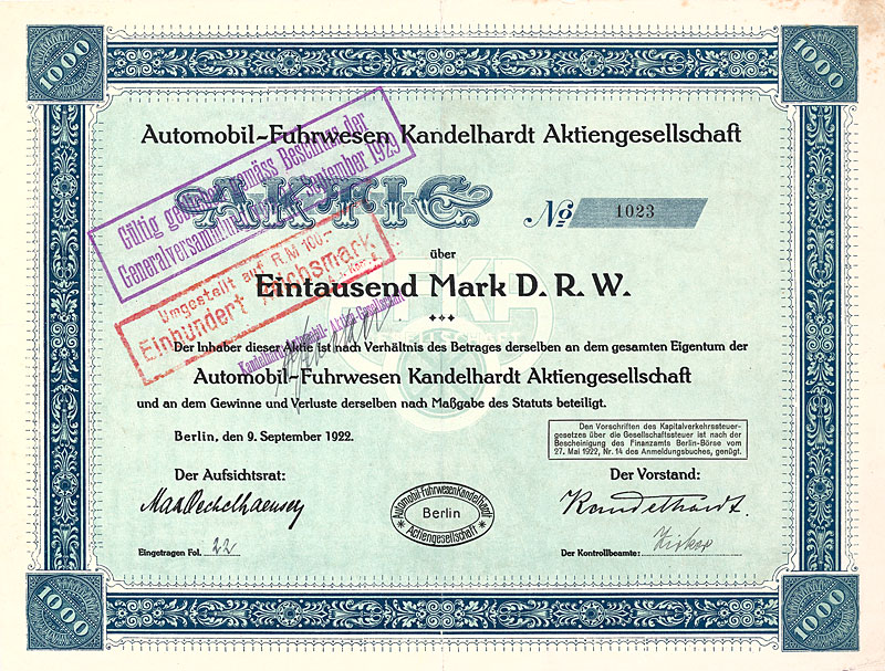 | Auflage: 4.000. Gründung 1906 zwecks Betrieb von Automobilfuhrwerken jeder Art, insbesondere von Automobildroschken und Luxusmobilen, ferner Übernahme von Automobil-Vertretungen, Handel mit Automobilen und Betrieb von Reparaturwerkstätten. 1926 umbenannt in Kandelhardt Automobil-AG. 1929 wurde der Wagenpark verkauft, der Fuhrbetrieb stillgelegt und die Börsennotiz in Berlin eingestellt. 1930 zog der Kandelhardt-Betrieb als einer der größten NSU-Händler in Deutschland auf sein neues Betriebsgelände zwischen Spreebogen und Landwehrkanal; als Teil der “Spreestadt Charlottenburg” siedelten sich dort ab 2002 erneut einige namhafte Automobilforscher und -entwickler an (u.a. gedas). In der Weltwirtschaftskrise konnten Steuern und Hypothekenzinsen für das alte Betriebsgrundstück SW 61, Gitschiner Str. 107 nicht mehr bezahlt werden, weshalb die Stadt Berlin 1933 die Zwangsversteigerung betrieb. Im gleichen Jahr folgte der Konkursantrag. Dekorative Umrahmung. Knickfalte etwas berieben, am oberen Rand eingerissen und hinterklebt. Rarität. (Einlieferer-Nr.: 69) | |||||||||