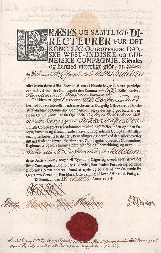 Der Überseehandel war ein großkapitalistisches Unternehmen. In die Forts, in die Plantagen, in die Schiffe, in die Waren (einschliesslich der Sklaven) mußten gewaltige Summen investiert werden. Der Staat hatte im allgemeinen weder das Geld noch die unternehmerischen Fähigkeiten. Daher wurde das benötigte Kapital durch Handelskompanien aufgebracht. Hier nehmen die Aktiengesellschaften ihren Anfang. In der Aktionärsliste obenan standen meist die Herrscher und Angehörige des Herrscherhauses. Von dieser hohen Stelle wurden der Gesellschaft denn auch gern Privilegien und Monopole verliehen. Die Königliche Dänisch Westindische und Guineische Kompanie wurde gegründet 1653 unter dem Namen Dänisch Westindische Handelsgesellschaft (1674 umbenannt). Der dänische König verlieh der Gesellschaft das Monopol für den Handel mit den Karibischen Inseln und der afrikanischen Küste. Im Gegenzug übernahm sie die Verwaltung und Verantwortung für für die Übersee-Dependancen sowie deren Unterstützung, Kultivierung, Verteidigung und Pflege des Rechtssystems. Zunächst war die Kompanie für die Westindische Insel St. Thomas in der Karibik (heute zu den Jungferninseln gehörend) verantwortlich. Bereits 1673 hatte die Kompanie die ersten afrikanischen Sklaven auf der Insel offiziell eingeführt. Im Jahre 1784 beanspruchte das dänische Unternehmen auch die Nachbarinsel St. John für sich, die bisher als Piratenstützpunkt diente. Dänemark kolonisierte die Insel allerdings erst 1718 mit Sklaven von St. Thomas. Nach dem Erwerb der Inseln St. Thomas und St. John machte der Zucker bereits die Hälfte der nach Kopenhagen verschifften Ladungen aus. Aufgrund des steigenden Bedarfs an den zuckergesüssten Produkten in Dänemark beteiligte sich die Kompanie an der Zuckerherstellung und gründete in der Nähe von Kopenhagen eine Zuckerraffinerie in der Form einer AG. Die steigende dänische Nachfrage nach raffiniertem Zucker führte zu einem ausgeprägten Kaufinteresse der Kompanie an der Insel St. Croix mit ihren weitläufigen Zuckerrohrplantagen. St. Croix, die grösste der drei Westindischen Inseln, befand sich seit 1651 in französischem Besitz. Nach Verhandlungen mit den Unterhändlern des französischen Königs einigte man sich auf einen Kaufpreis von 195.000 Reichstalern. Der Vertrag für die Abtretung der Insel an die Königliche Dänisch Westindische und Guineische Kompanie wurde schliesslich am 15.6.1733 von dem Abgesanden und Vertreter des französischen Königs, dem Grafen von Plelo und dem Bürgermeister Friedrich Holmstedt stellvertretend für die Kompanie ratifiziert. 1734 erhielt die Kompanie das Oktroy mit dem Alleinrecht, in Kopenhagen eine Zucker-Raffinerie anzulegen. Gleichzeitig erhöhte der Staat den Zoll auf ausländischen Zucker und wenig später verbot er seine Einfuhr ganz. Das Unternehmen sicherte sich in den folgenden Jahren nicht nur das Monopol für Import und Raffinierung von Rohzucker in Dänemark, sondern auch das für Norwegen. Das Zuckermonopol erwies sich als äußerst lukrativ und gewinnbringend für die Kompanie, die innerhalb von 20 Jahren die Zuckerproduktion in St. Croix so ausgebaut hatte, dass sie nicht nur den heimischen Markt, sondern auch das Ausland mit Zucker beliefern konnte. Konkurrenzdruck und weitere Schwierigkeiten führten 1754 zur Auflösung bzw. Übernahme des Unternehmens durch die dänische Krone. Der König zahlte die Aktionäre aus, und der dänische Staat kaufte der Kompanie die Insel St. Croix ab. Sie blieb im dänischen Besitz bis 1917, als sie zusammen mit St. John und St, Thomas für 25 Mio. $ an die USA verkauft wurde. Die 1734 ausgegebene Aktie verbriefte einen verhältnismässigen Anteil an der gesellschaftseigenen Zuckerraffinerie in Kopenhagen. Sie ist somit die älteste bis heute bekannt gewordene Aktie einer Zuckerraffinerie. Interessant dabei ist, daß der Kaufpreis von 195.000 Reichthalern über die Ausgabe von Aktien finanziert wurde. Vergleichsweise kommt dieses Finanzierungsmodell den heutigen geschlossenen Immobilienfonds auf Aktien- oder Anteilbasis am nächsten. Der Aktionär erwarb einen verhältnismässigen Anteil an der Insel St. Croix sowie an allen Wertgegenständen, Privilegien und Rechten der Königlich Dänisch Westindischen und Guineischen Kompanie. Die Interimsaktien wurden 1733 und die endgültigen Aktien 1734 emittiert. Druck auf Büttenpapier mit Wasserzeichen. Mehrere Originalsignaturen, Lacksiegel der Kompanie, Doppelblatt mit inwendigen Zahlungsvermerken sowie Übertragungsvermerk von 1740 auf Christian Ramus. Von dieser wirtschafts- und finanzhistorisch hochinteressanten Aktie sind nur vier Exemplare bekannt. Museal.