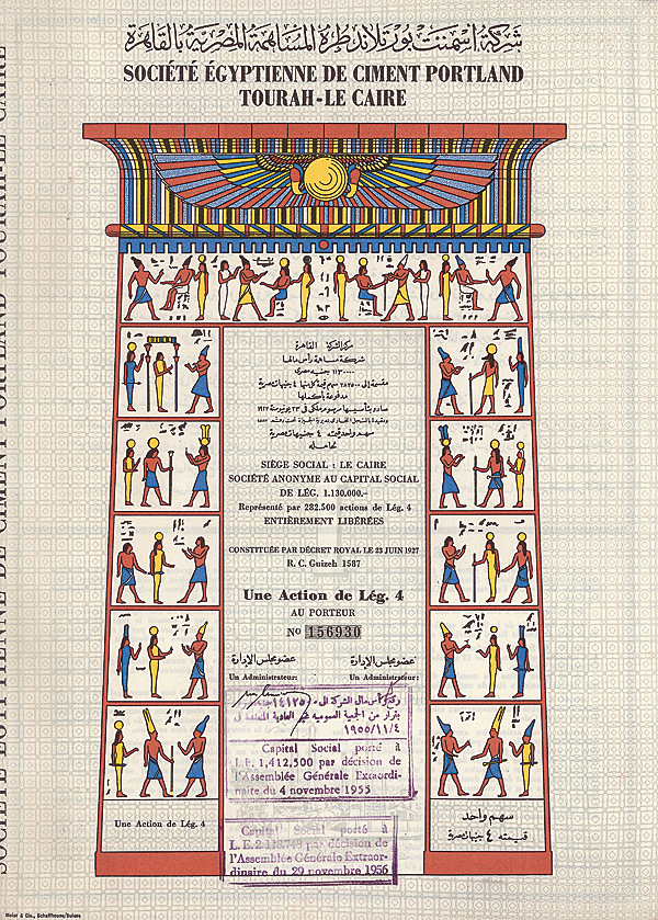 Gründeraktie mit Faksimile-Unterschrift W. Schmidtheiny, zu dessen (noch heute weltgrößtem) Schweizer Holderbank-Zementkonzern die Gesellschaft bis zur Verstaatlichung durch Nasser in den 50er Jahren gehörte. Die Gründung erfolgte durch Dekret des Königs von Ägypten. Sitz war das wegen seiner Pyramiden berühmte Giseh, heute ein Vorort von Kairo. Die Zementfabrik liegt ebenfalls nahe bei Kairo in Tourah. In Giseh war auch das 1864 von Ismael Pascha gegründete Ägyptologische Museum untergebracht. Offenbar durch die räumliche Nähe angeregt, zeigt die vielfarbig gestaltete Aktie das Tor aus der Vorderfront des berühmten Tempels zu Edfu. Dieser Tempel, der am vollständigsten erhaltene in Ägypten, ist vor allem wegen seiner zahlreichen astronomischen Darstellungen bekannt. Anspruchsvoller Druck durch Meier & Cie., Schaffhausen. Zweisprachig arabisch/französisch. Mit anh. restlichen Kupons. Äußerst seltenes, herausragendes Papier!