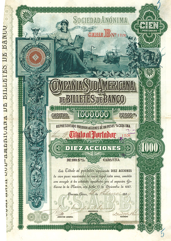 Bedeutendste Bank des Landes, gegründet am 28.1.1881 als Nachfolgerin der Emissionsbank “Banco Espanol de la Habana”. Bis zur Besetzung durch die USA war sie Notenbank. Hochwertiger Stahlstich der American Bank Note co., sehr dekorativ. Mit anh. restlichen Kupons. Finanzhistorisch ein überaus wichtiges und extrem seltenes Papier!