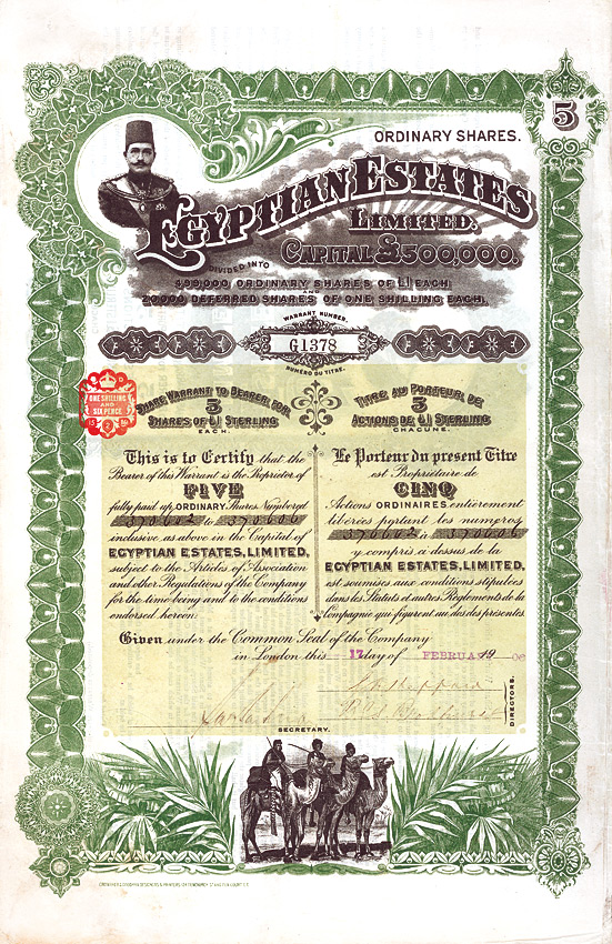Gründeraktie. Die 1905 gegründete Gesellschaft kaufte in Ägypten und im Sudan größere Ländereien zwecks Parzellierung und anschließendem Verkauf. Die Zentrale der Ges. befand sich in Alexandria. Bereits 1910 in Liquidation. Großformatiges Papier. Vignette mit Portrait-Abbildung eines ägyptischen Würdenträgers, unten Kamel-Reiter. Zweisprachig englisch/französisch. Rückseitig Bedingungen und Portrait. Original signiert von G.A. Sheppard (Deputy-Chairman) und B.E.S. Brodhurst (leitender Direktor). Mit anh. restlichen Kupons.